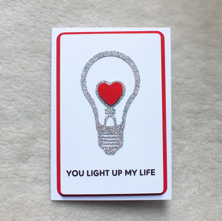 This handmade Valentine's Day card, takes a more contemporary approach. But could be used to tell someone how much you love them at any time of the year. It is 5 1/4"x3 3/4" in size, matted and layered with red and white card stock, die-cut silver glitter light bulb with red heart. It has been left blank inside for your own message.