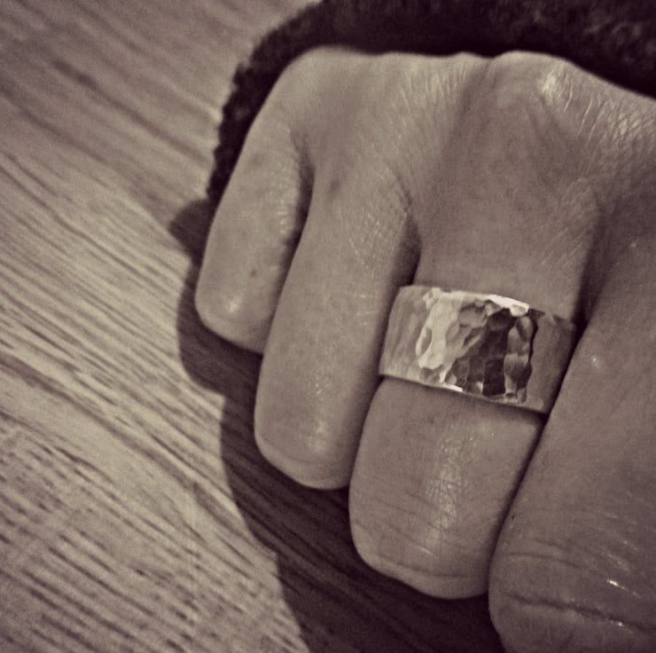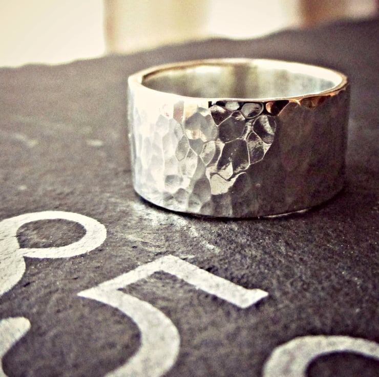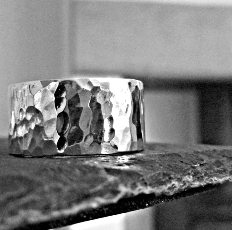 I hammer all around the band to create lots of little facets, then give it a super polish for a mirror finish...just watch the light bounce from this baby!
