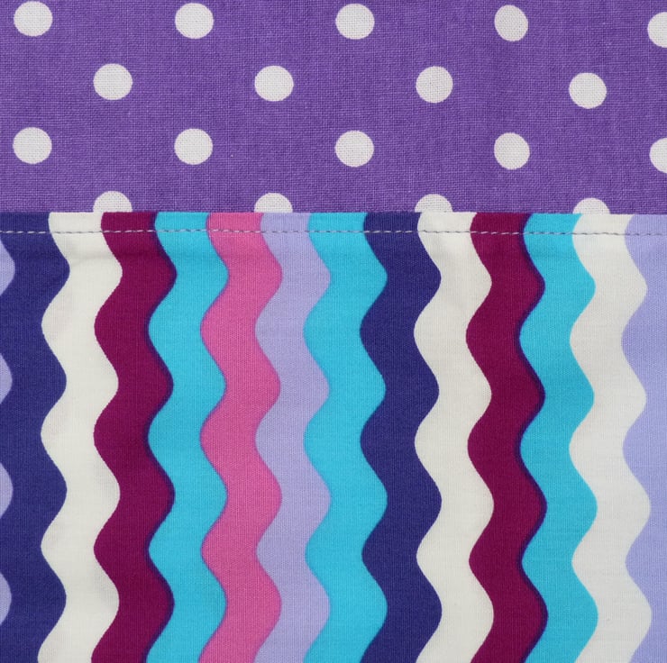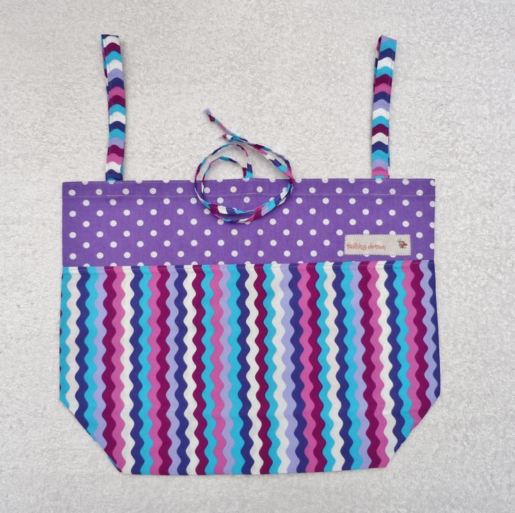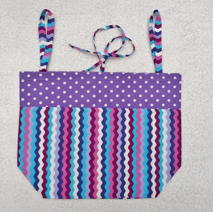 This useful tote bag has been created using 2 complimentary fabrics to make a bright bag. It is a mix of cotton and poly-cotton and measures w17.25" x h13.25" with a gusset of 5.5" and strap length of 14.5". There are 2 ties so the bag can be folded and carried in your handbag. When folded it measures 3.5" x 3.5" x 1".