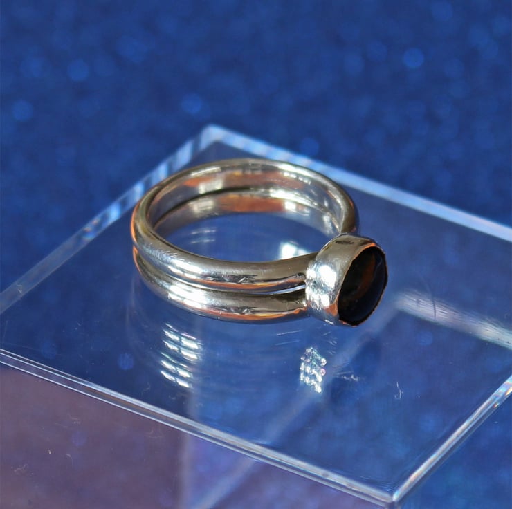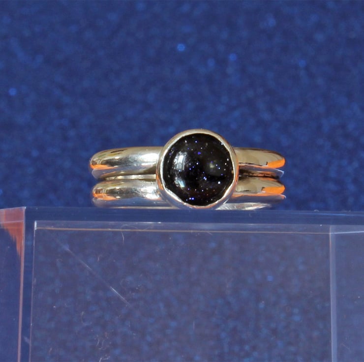 It is composed of sterling silver and features a very dark, translucent blue sun stone that is suffused with sparkly twinkles. This stone is 8mm across and its setting is 3mm high. The ring itself is size 7 (size O, UK). The stone setting is very slightly off center (hardly noticeable !), hence I am putting it in the sale.