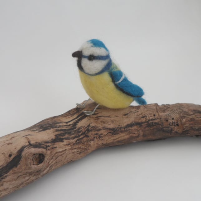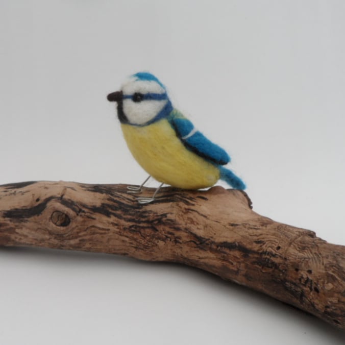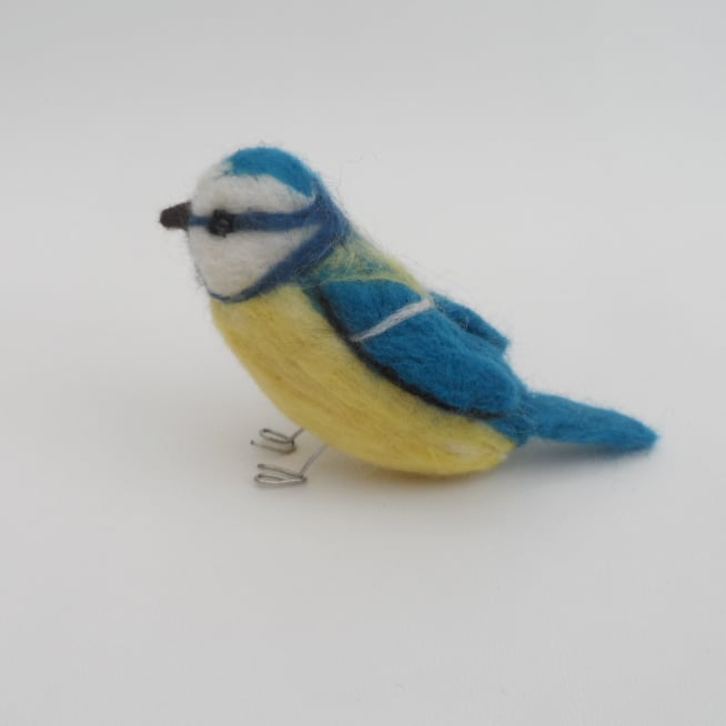 This sweet little blue tit has been needle felted using merino wool over a core wool. It is approximately life-size measuring 11.5cm (4.5") long by 6cm (2.4") tal. It has beaded eyes and wire legs for stability.