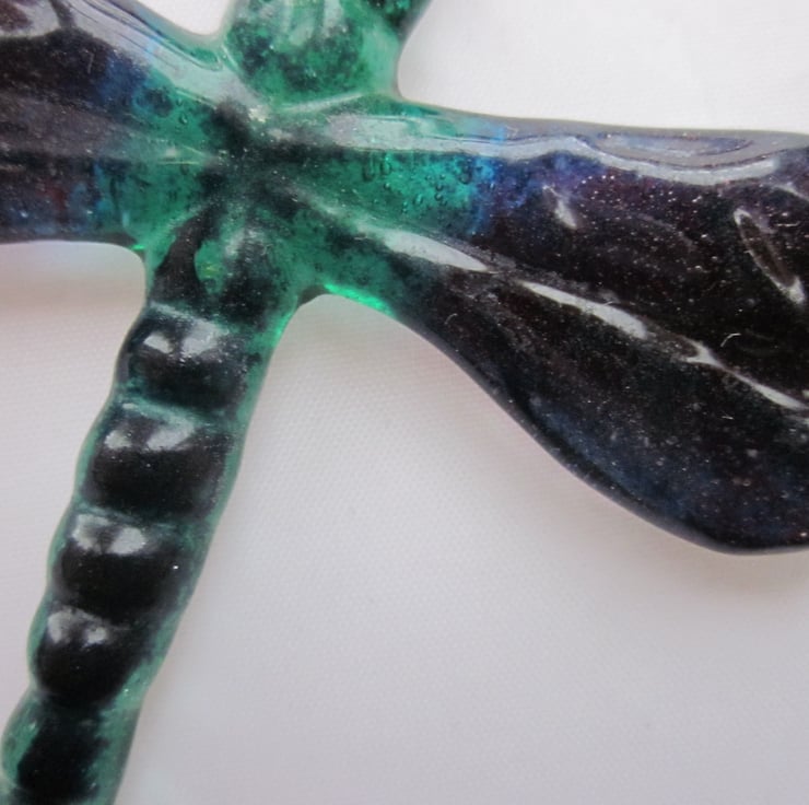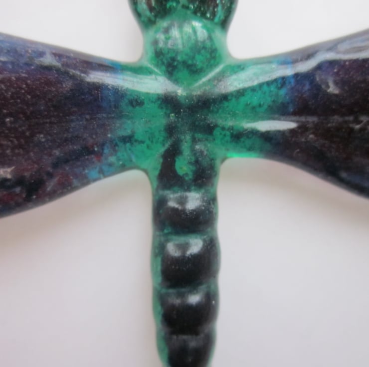 It is a stunning dragonfly, with an emerald green body and wings in purple and royal blue. The glass is very tactile with raised veins in the wings and three dimensional body. Beautiful! It has a copper loop as it's antennae, allowing this ornament to be worn as a pendant but it might equally be used as a small suncatcher in a window.