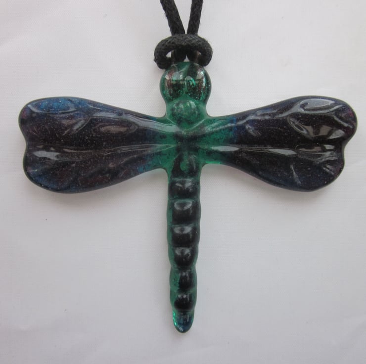 It is approximately 5cm high and 6.5cm across - this is a bold piece of costume jewellery and not a delicate trinket. It comes with a black cord necklace. A gorgeous piece, each dragonfly is individually made and one of a kind.