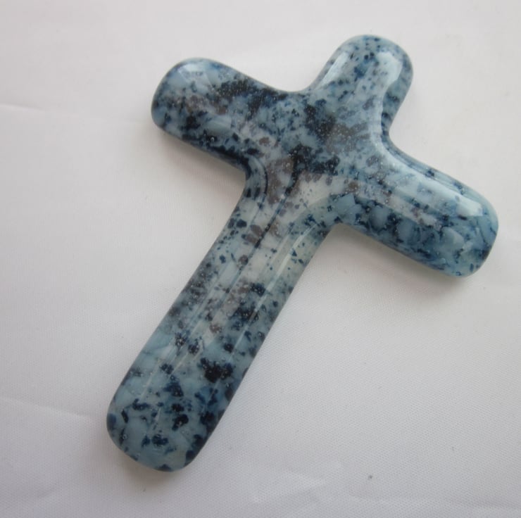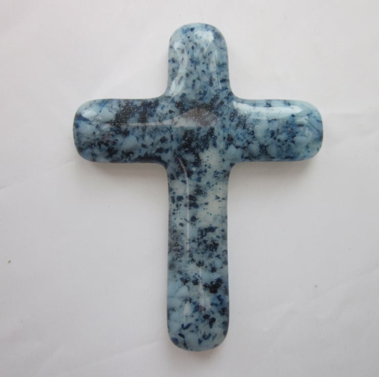 It is a beautiful cross, with aventurine blue frit cast within an ivory base and encased in clear glass. A lovely combination of glass.