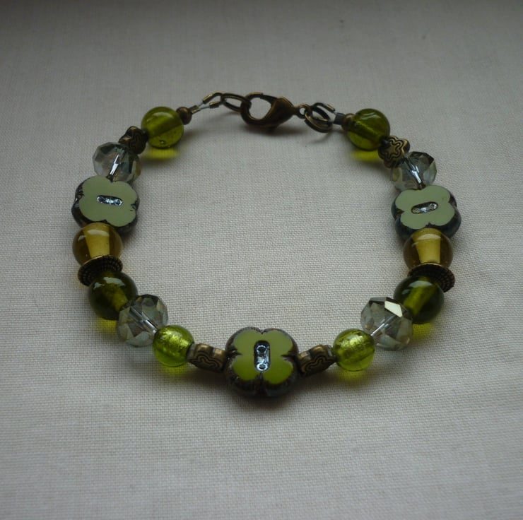 THE BRACELET HAS BEEN MADE WITH A SELECTION OF GLASS BEADS IN DIFFERENT SHAPES AND SIZES IN SHADES OF GREENS ALONG WITH ANTIQUE BRONZE SPACER BEADS, LOBSTER CLASP AND FINDINGS.