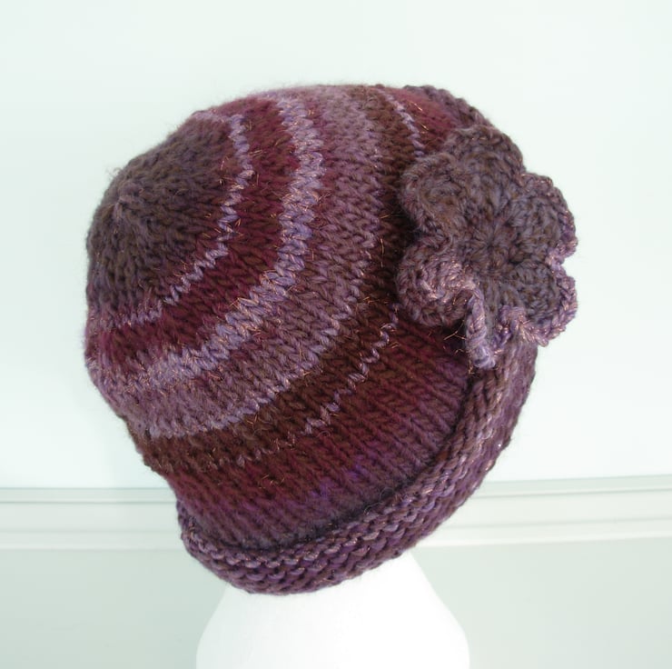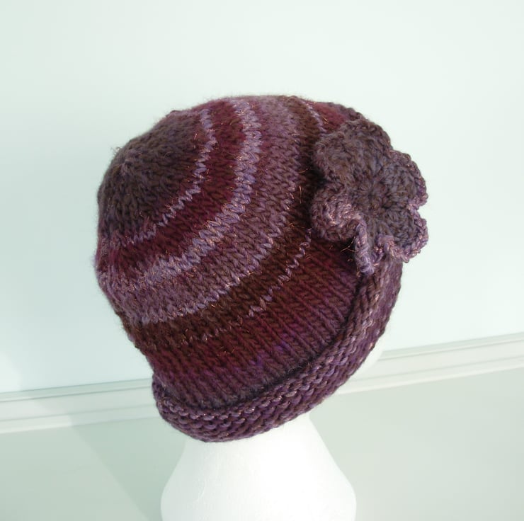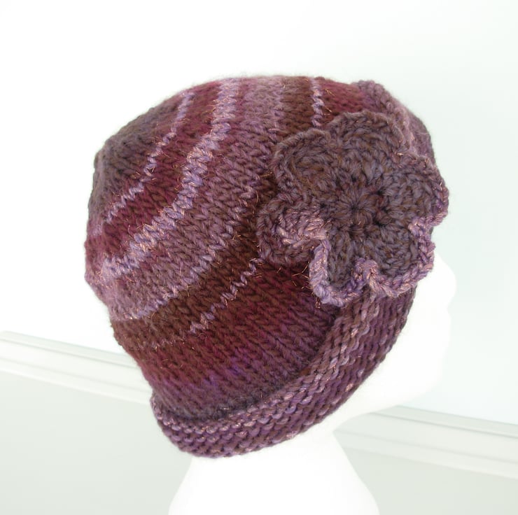 I've knitted this adults beanie hat in a lovely chunky acrylic and wool yarn. Graduating shades of plum with a little bit of sparkle.