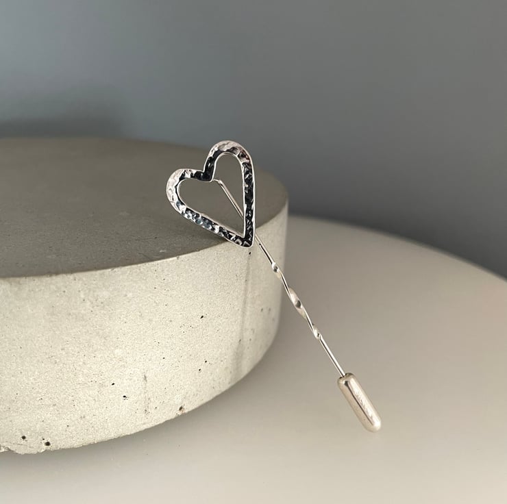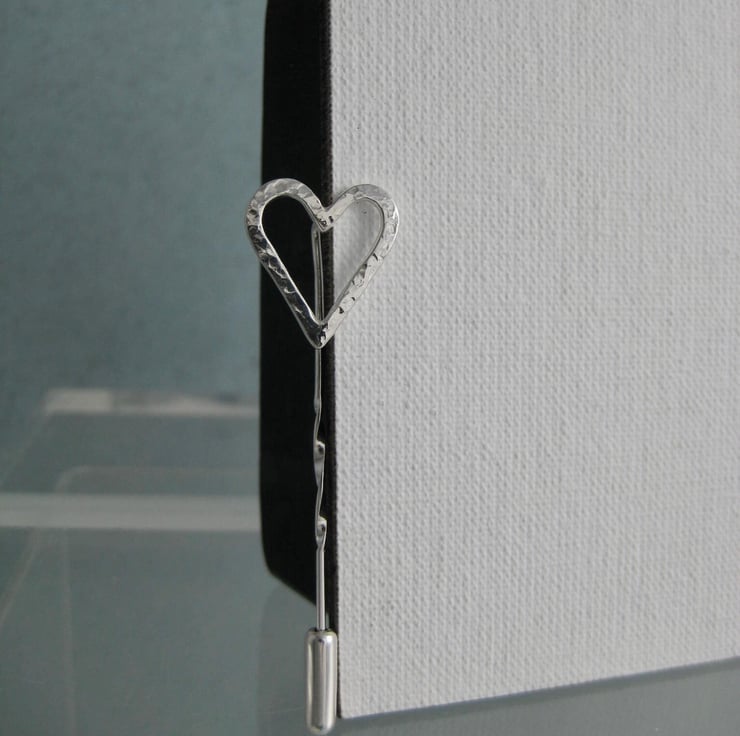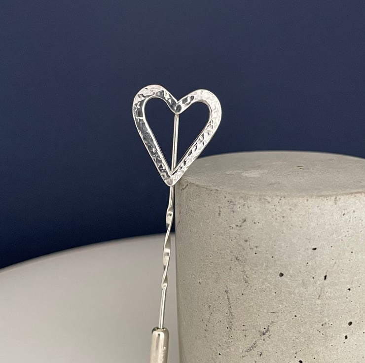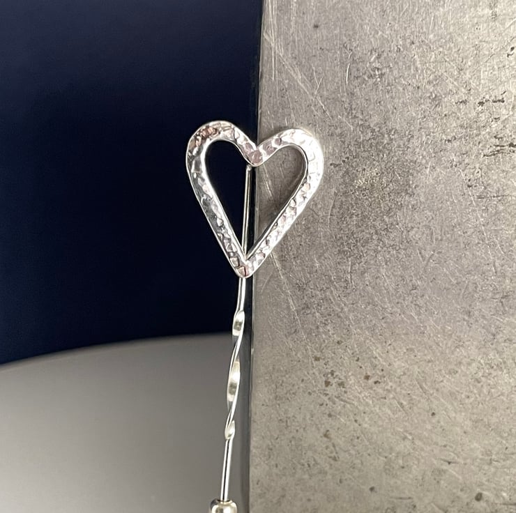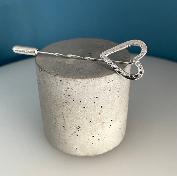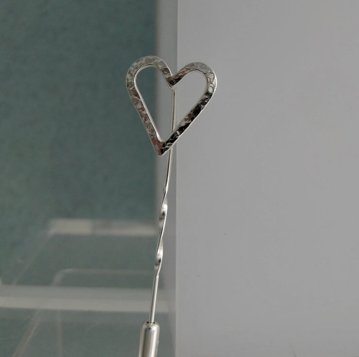 A lovely heart stick pin handmade from 925 Sterling Silver. Cut by hand from solid 1.5mm thick silver wire, made into a heart then hammered it to create it’s attractive sparkly textured surface. Set onto twisted pin and secured with a push-on pin protector.