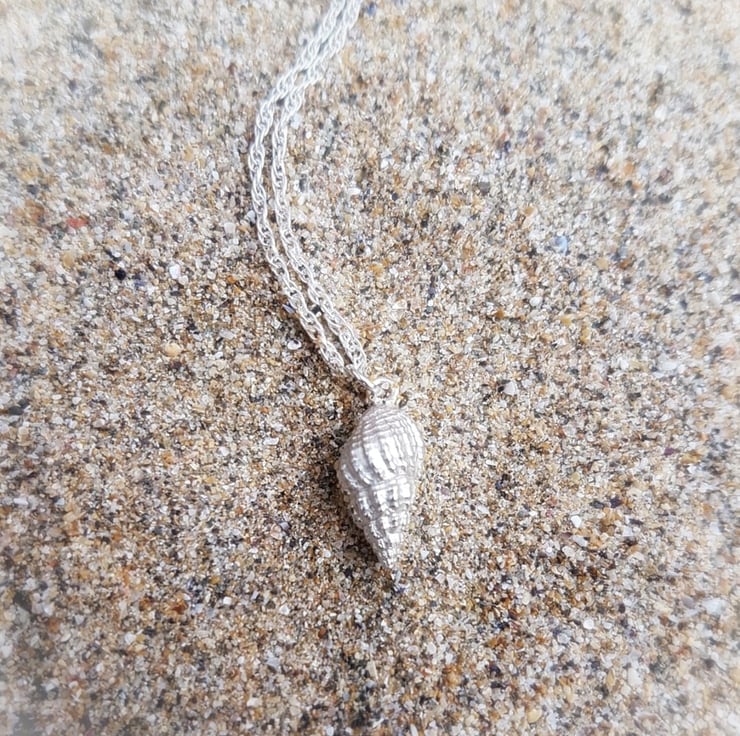 This sweet little necklace is made from a 'Netted Dog Whelk shell cast into solid sterling silver and hangs on an 18 inch sterling silver chain.