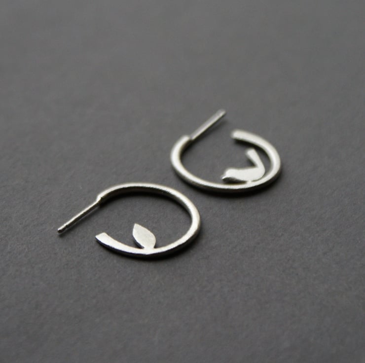 Cute little hoop earrings featuring a little bird on one side and a leaf on the other side. Soldered within a hand forged irregular open circle for an organic feel and finished with a lovely frosted texture which has a subtle sparkle and is slightly rough to the touch. Perfect for everyday wear and a great gift!