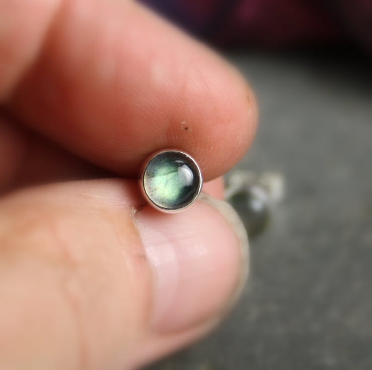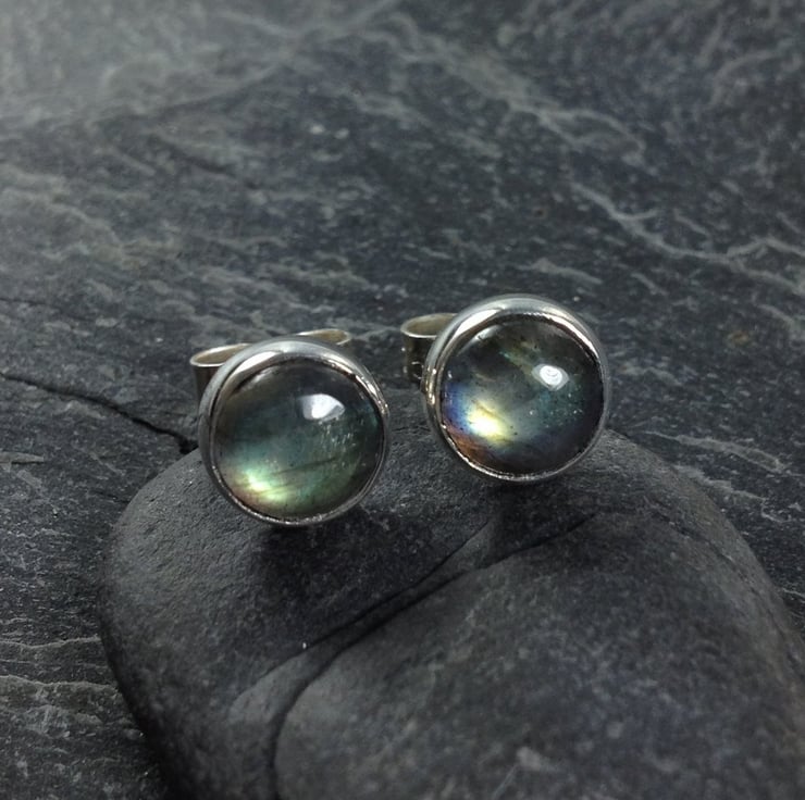 Simple small sterling silver stud earrings set with stunning flashy labradorite cabochons.