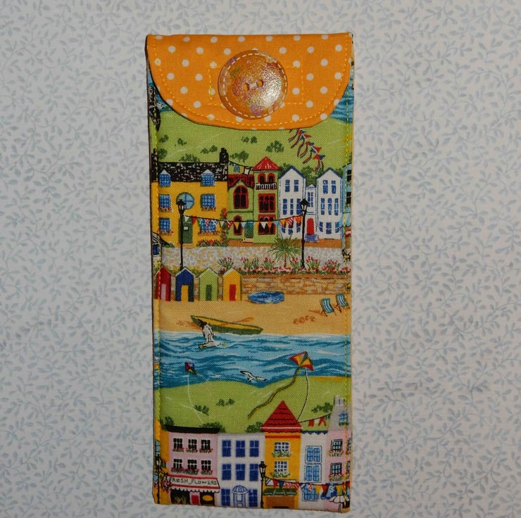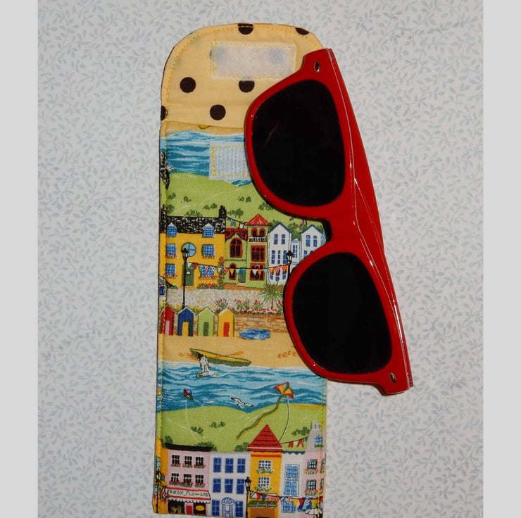 This is a handy case for your glasses or sunglasses, which is made from a beautiful beach scene cotton fabric, with a toning yellow spot fabric, and lining. It also has a layer of wadding for protection. The case fastens with Velcro and has a decorative button. It would make a great sunglasses case for holidays or just to brighten up any day..