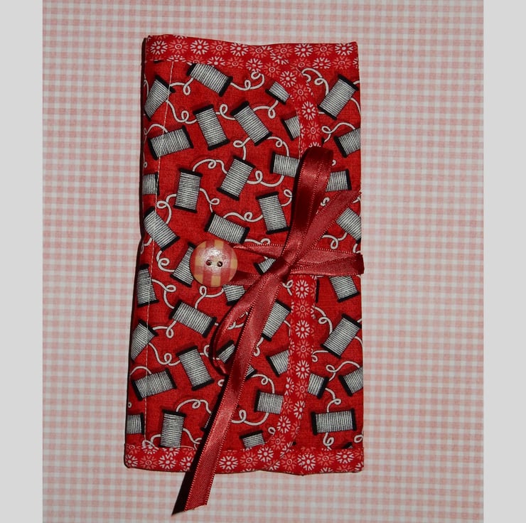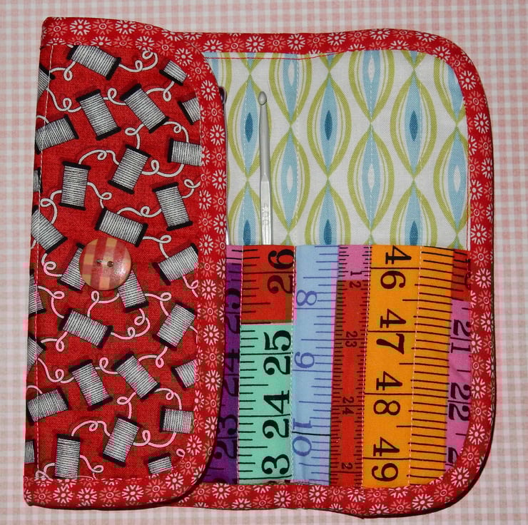 This is a bright modern crochet hook holder, which has 11 pockets, some are slightly wider to fit in larger hooks, or other tools. More that one hook could be held in the pockets depending on size. The outer fabric features spools of thread, the pockets are made from tape measure print fabric, and it is lined in a toning fabric. It fastens with a pretty button and ribbon. The edges have a pretty red binding.