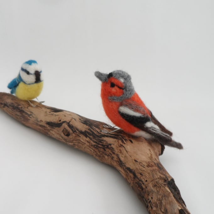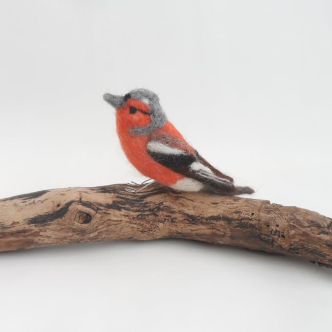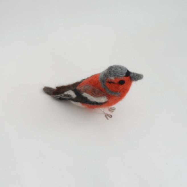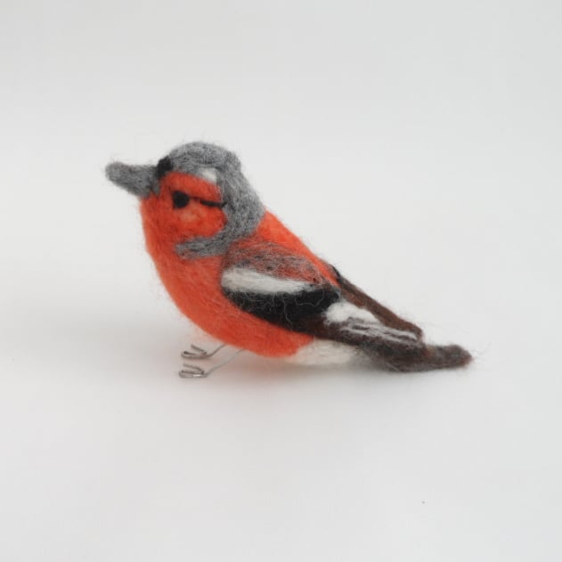 A British garden bird, this chaffinch has been needle felted using merino wool over a core wool. It is approximately life-size measuring 13.5cm (5.3") long by 7cm (2.75") tall. Wire legs have been added for stability.