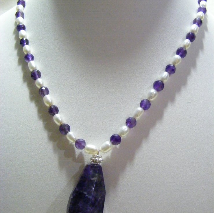 Amethyst drop is threaded centrally onto beading wire with approx 6 mm white freshwater cultured pearl rice beads and 6 mm amethyst faceted rounds each side of the drop to make up the necklace.
