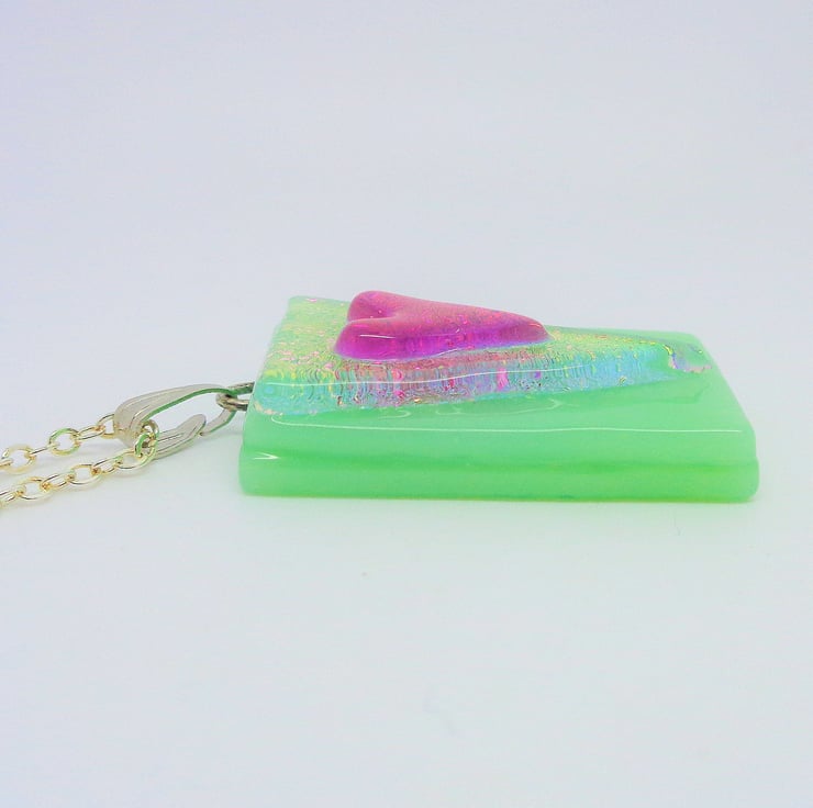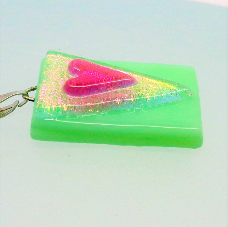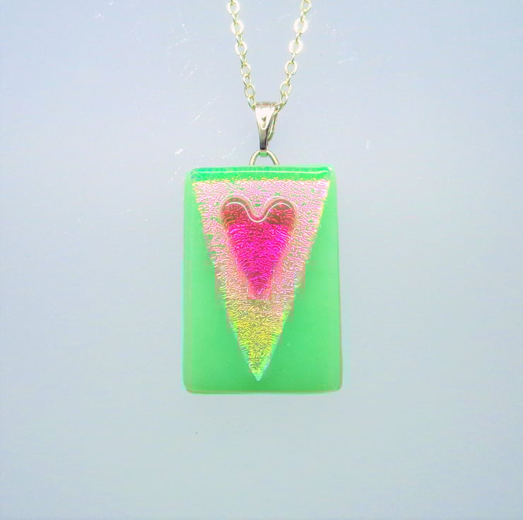 A pale green fused glass base with an integral sterling silver wire hook, topped with a shimmering triangle topped with a sparkly deep pink heart. The colours will change as you move.