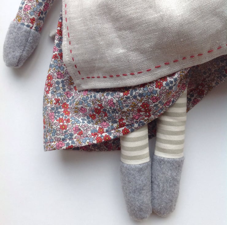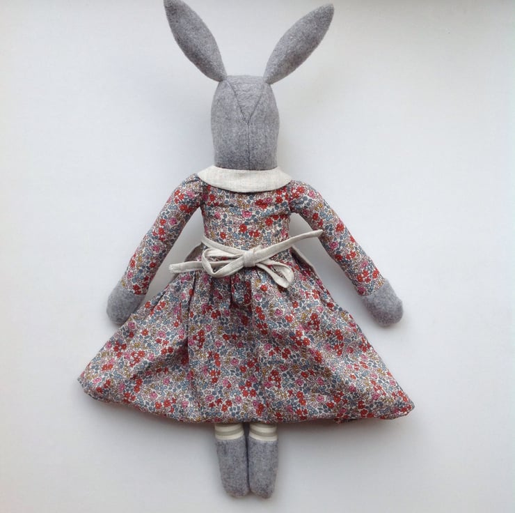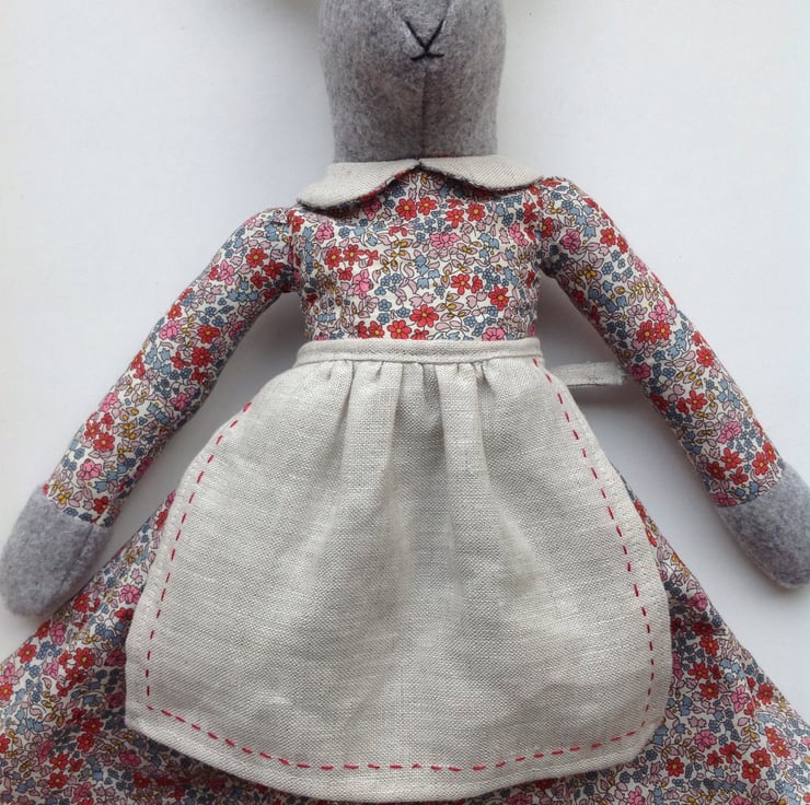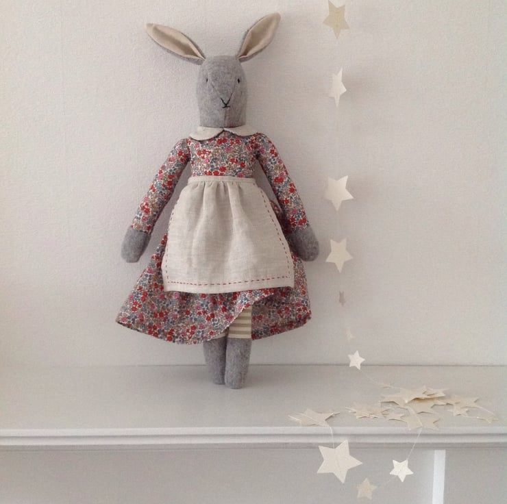 A handmade grey Rabbit ornament based on vintage toy patterns from the 1940's. Lovingly stitched by hand and machine using the finest Emilias Flowers tana lawn fabric from Liberty of London. Mrs Rabbit has a hand embroidered linen apron which is detachable and a co-ordinating Liberty and linen lined collar. She has stripy legs made from heavyweight cotton and a face and paws made from woollen coating fabric. Filled with habico non allergenic polyester toy filling. She is able to sit or stand if propped up. 18 inches long makes her a perfect size for children of many ages. She would make a beautiful addition to any nursery or bedroom and would be an heirloom providing many hours of friendship. I myself still have a rabbit from my grandmother who was the inspiration behind this product. All seams have been overlocked for a professional finish but due to the delicate nature of hand embroidery spot cleaning only is advised.