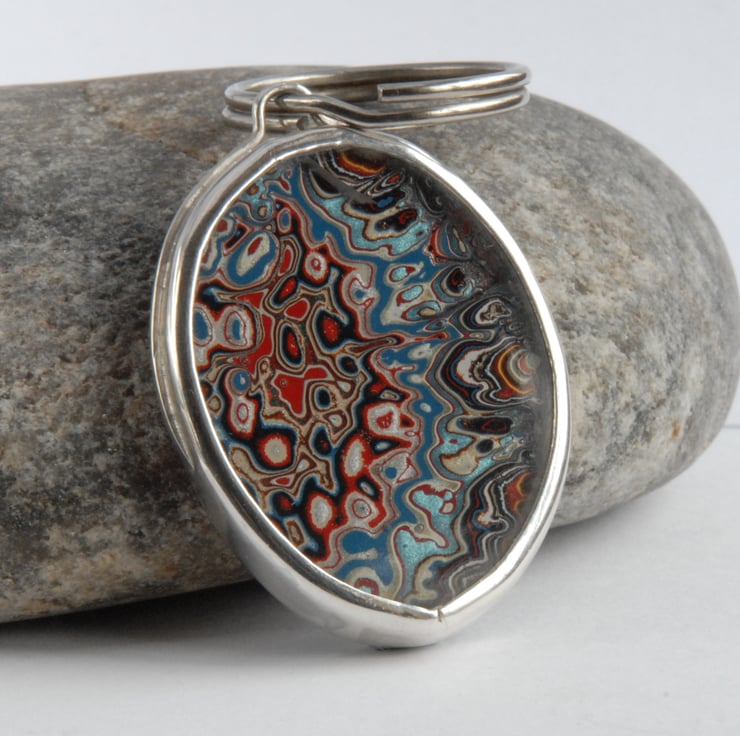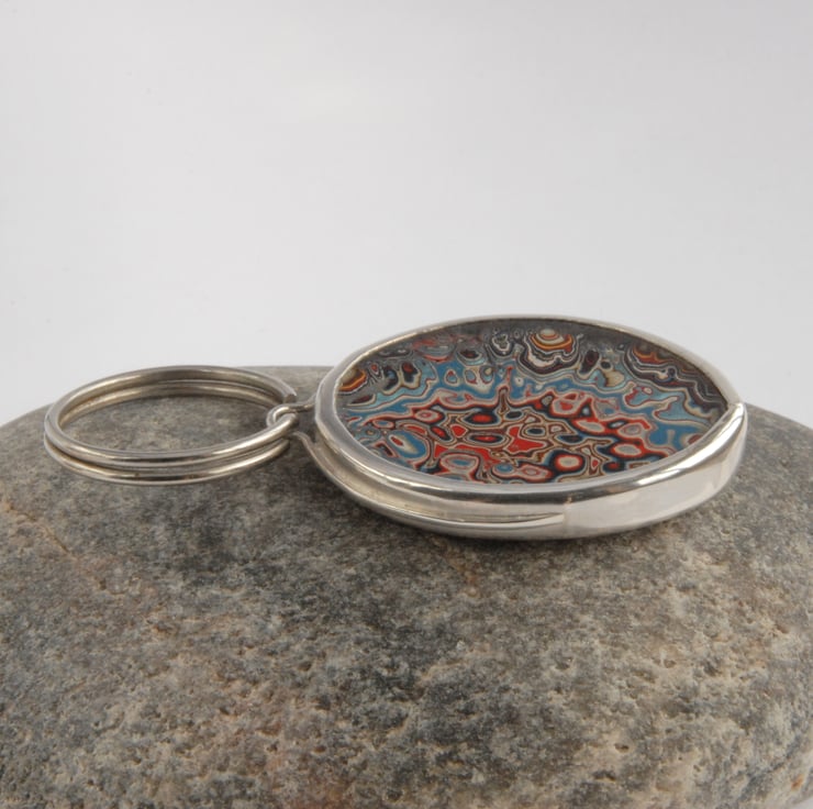 Specially made for Siobhan, this keyfob featured a piece of vintage fordite that has been set in epoxy resin for durability. The fordite has been bezel set in sterling silver with a steel key ring.