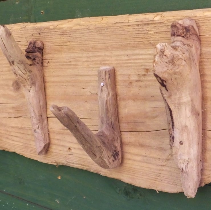 It has been made from driftwood found on beaches in Cornwall. The four hooks are all pieces of driftwood, glued and screwed or pinned to the backing board. It has been very lightly sanded to remove nasty splinters but still retains it's rustic feel.