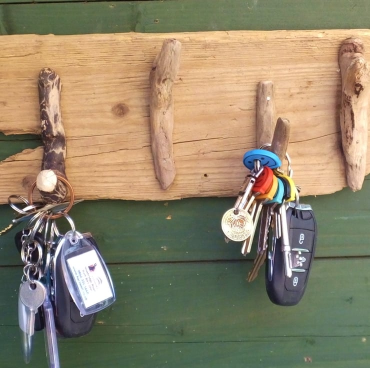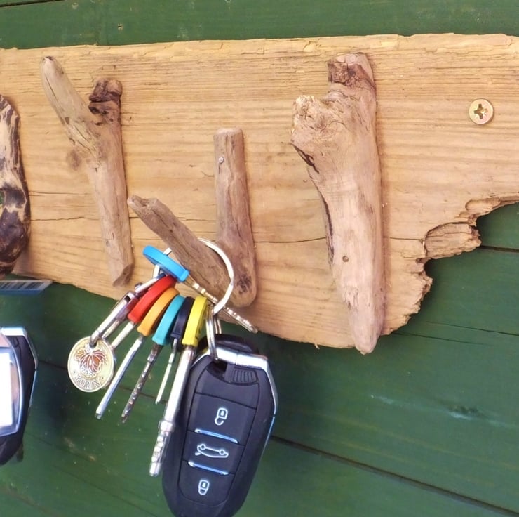 Driftwood  rack holder four wooden hooks car, shed, garage, beach hut keys