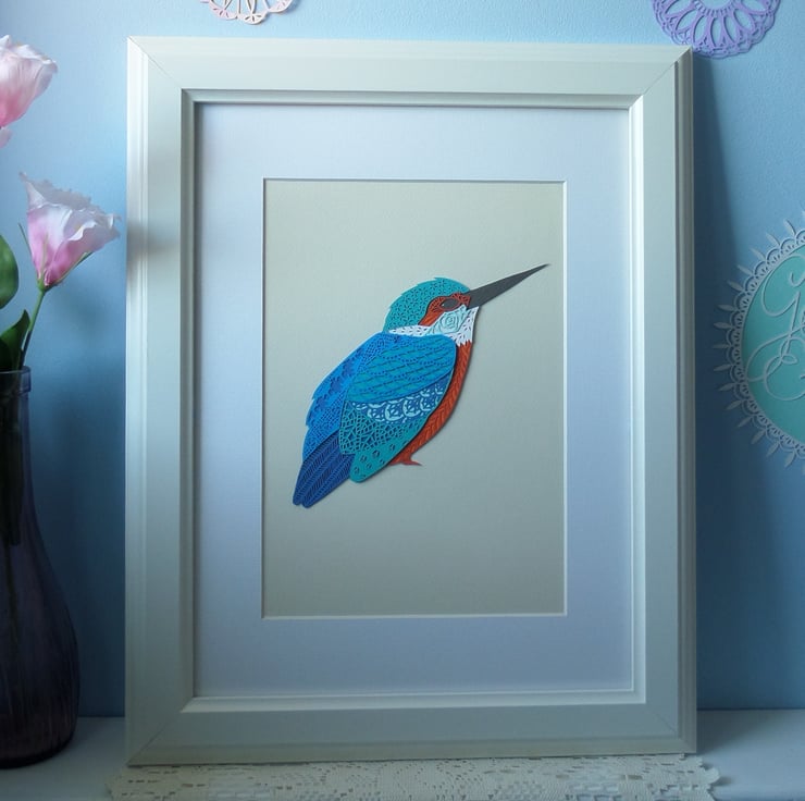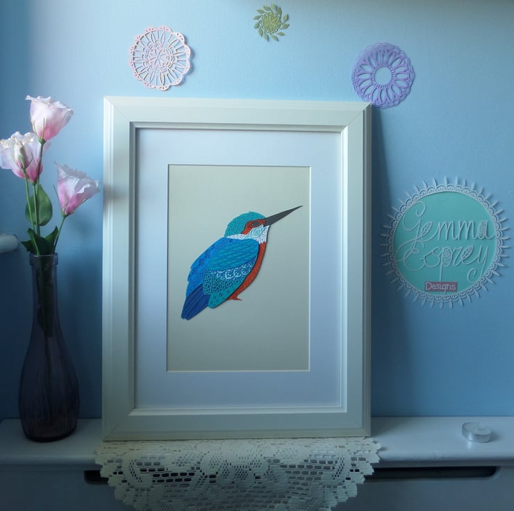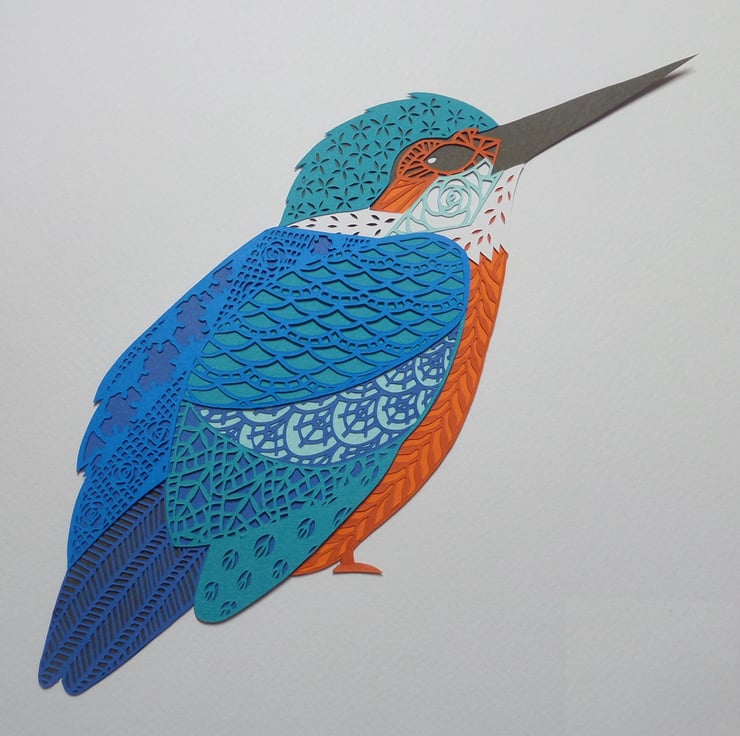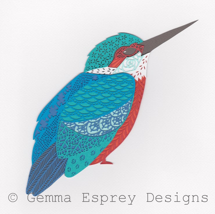 This is an A4 (approx 210 x 297 mm) Giclee print of the original 'Kingfisher' layered papercut which was designed and hand cut by Gemma Esprey.