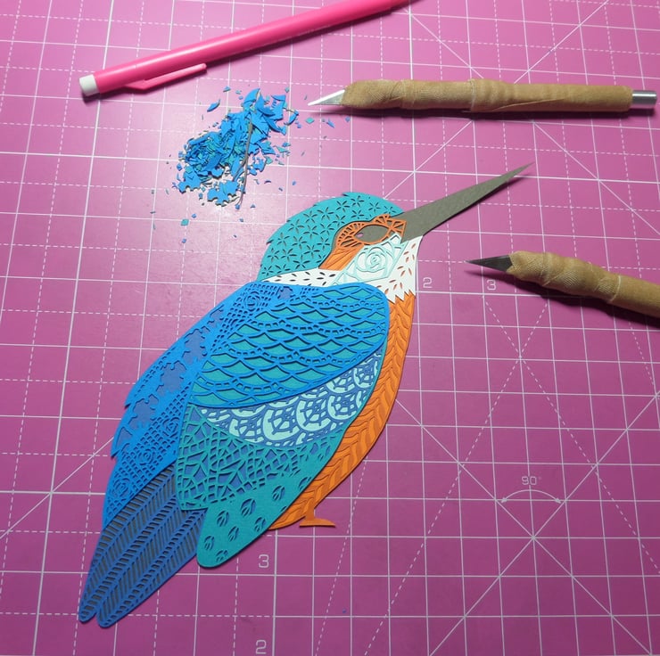 This year I have been focusing more on drawing birds. Following on from my Robin and Gentoo penguin layered papercuts, I wanted to do something more colourful where I could incorporate more layers and a kingfisher really fit the bill. I spent a lot of time using different mediums (paint, colouring pencils, fibre pens and drawing inks) and deciding on the shape and angle of the drawing. I'm really happy with the result and love all the blues and how they fit together.