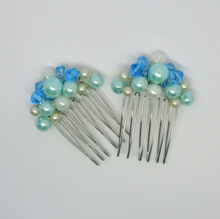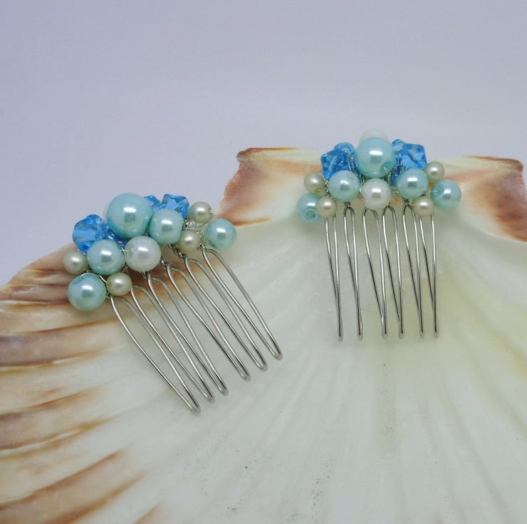 The combs are 2cms wide plus beads. The colour of the crystals is more turquoise (closer to the glass pearls) than appears in the pictures. Either my camera or monitor (or both) refuse to reproduce turquoise shades accurately.