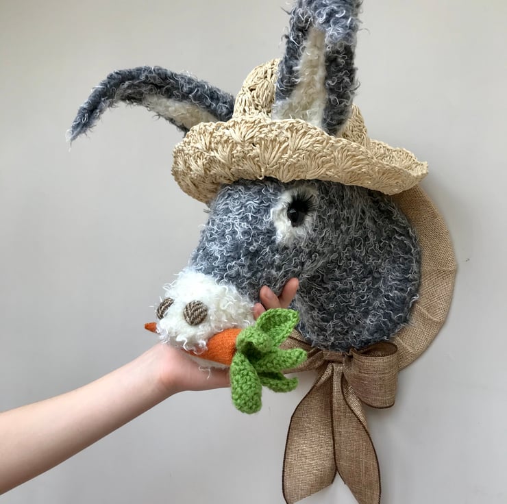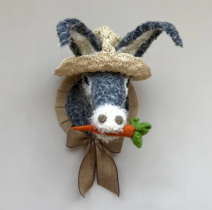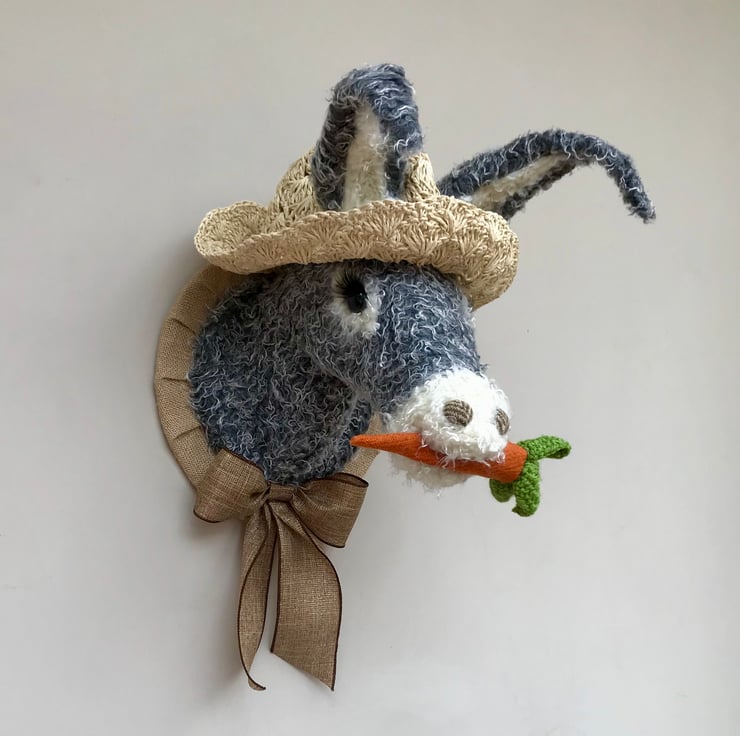 Handmade grey and cream beach donkey with carrot and straw hat.