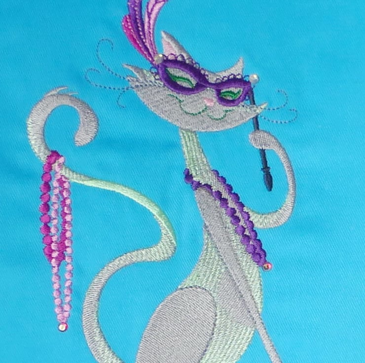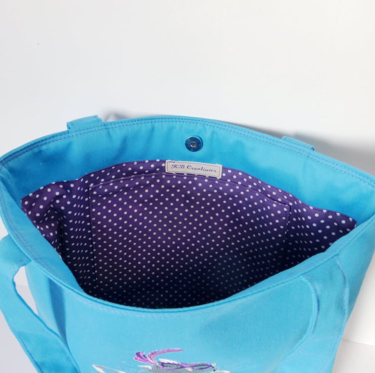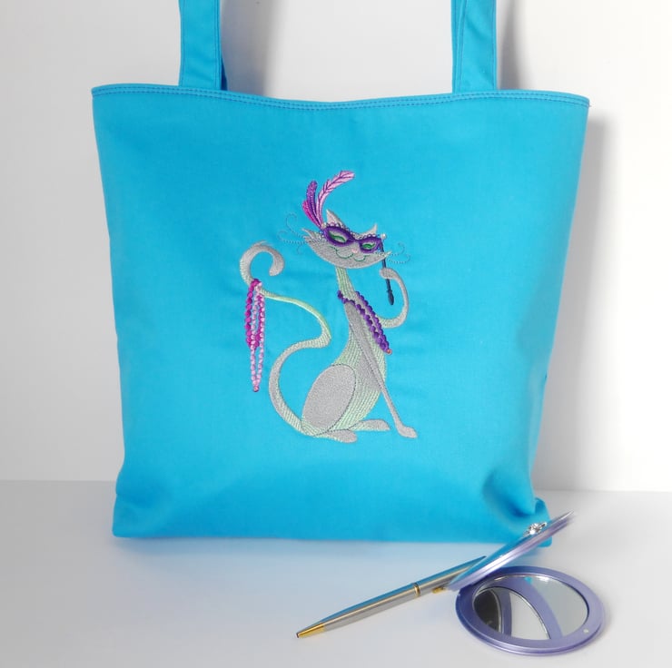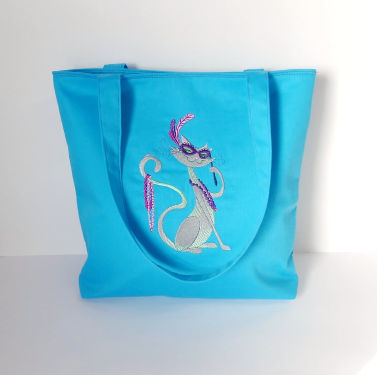 A medium size tote bag made of turquoise cotton drill fabric, embroidered with a 'Carnival Kitty'.