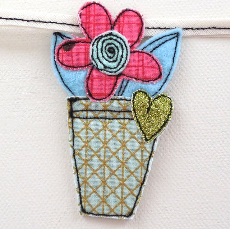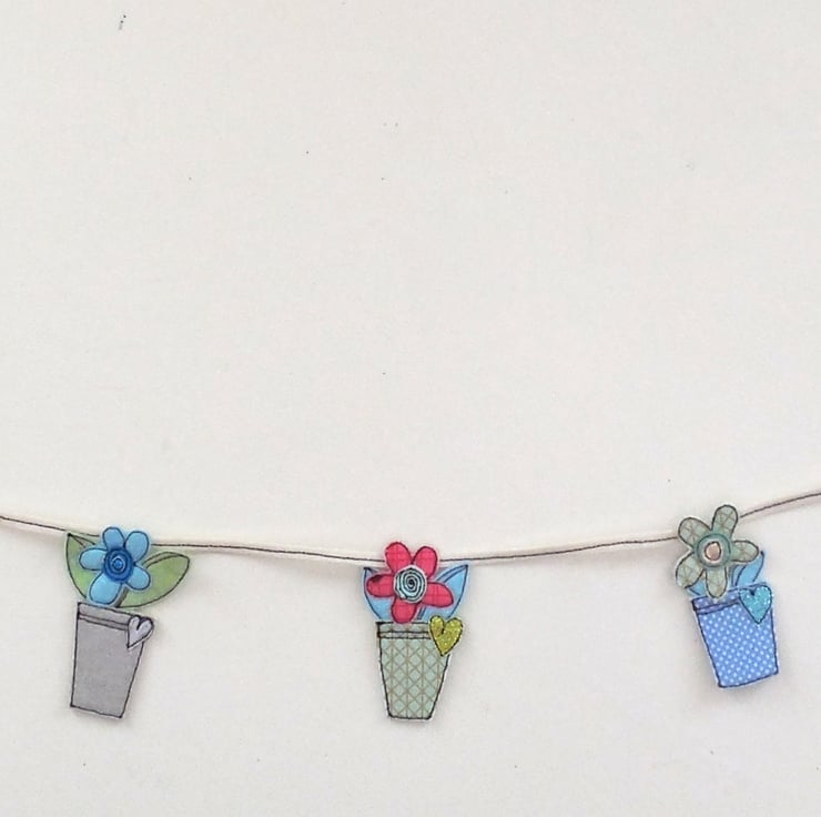 Flower pot bunting measures approximately 120cm with nine flower pots suspended along its length. Each pot is sewn using different cotton cloths and has a glitter fabric accent. At each end of the length there is a loop to hang and a glitter heart. This delightful decoration can be used to decorate many different rooms in your home.