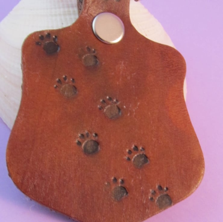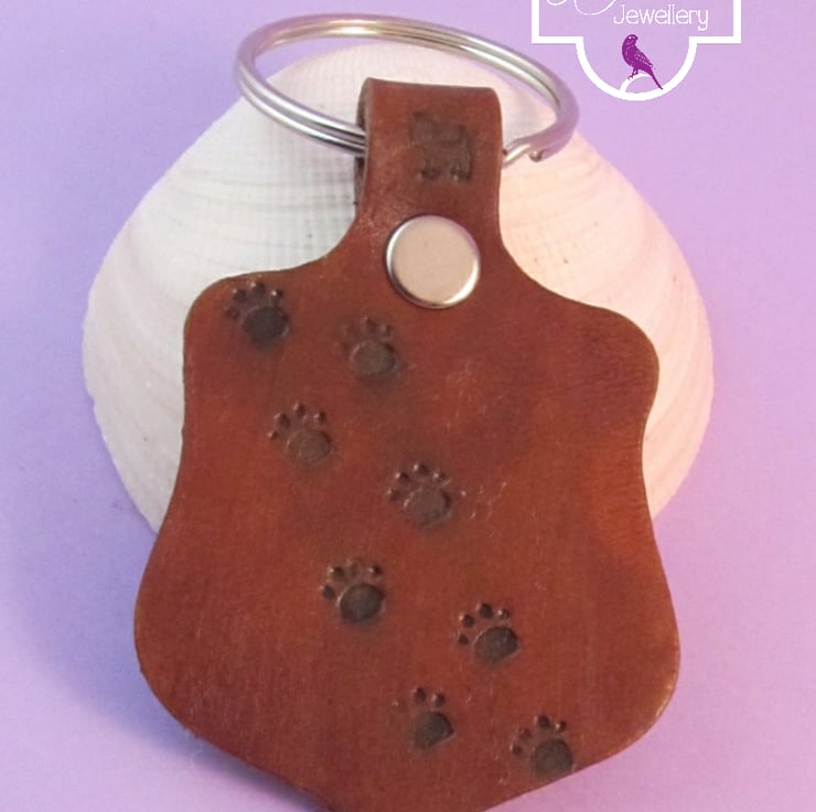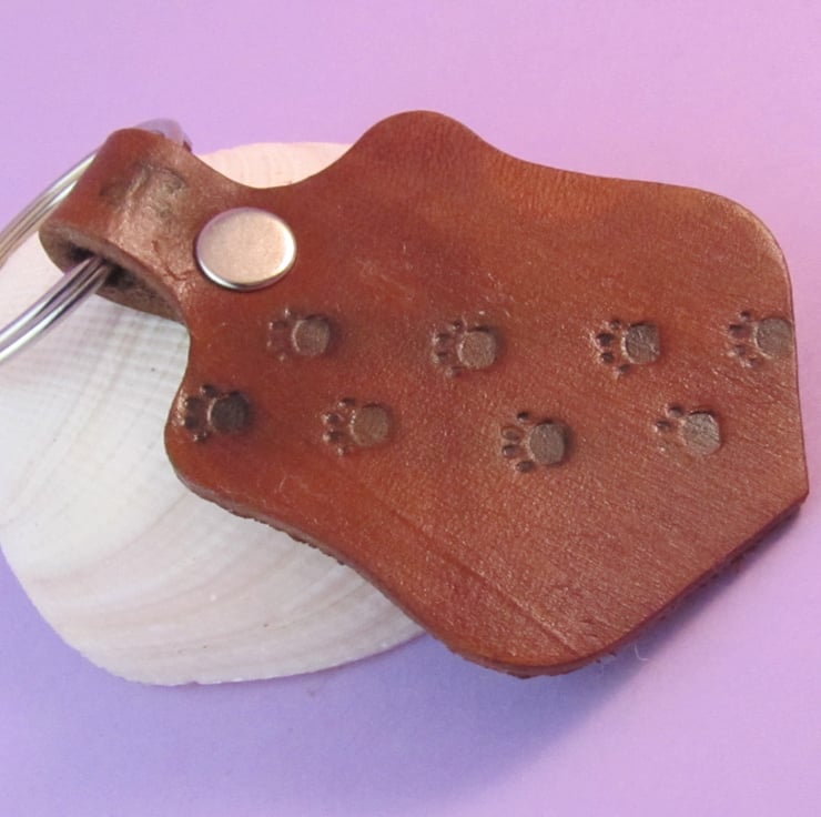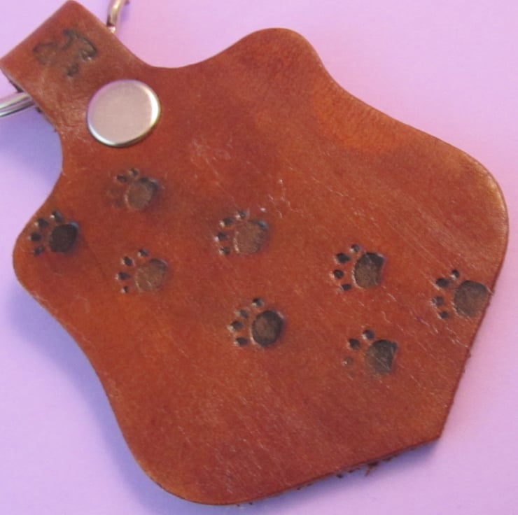 This is a lovely dog paw print brown leather keyring. It is created by hand stamping and hand dyeing real veg tan leather. This would make a great gift for dog lovers, or for pet lovers in general.