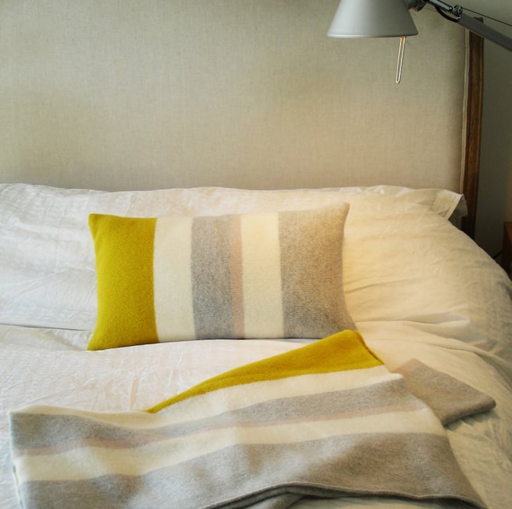 Lambswool throw in a contemporary striped colour combination of warm white, sunflower yellow, palest grey and putty. The throw adds interest and colour to either bed or sofa.