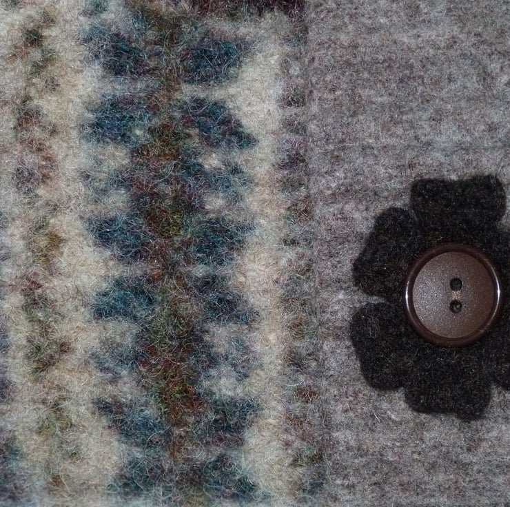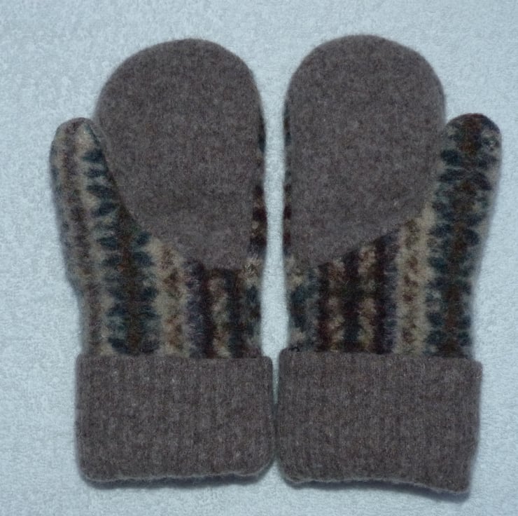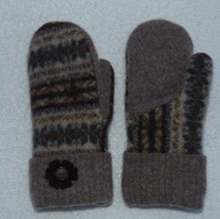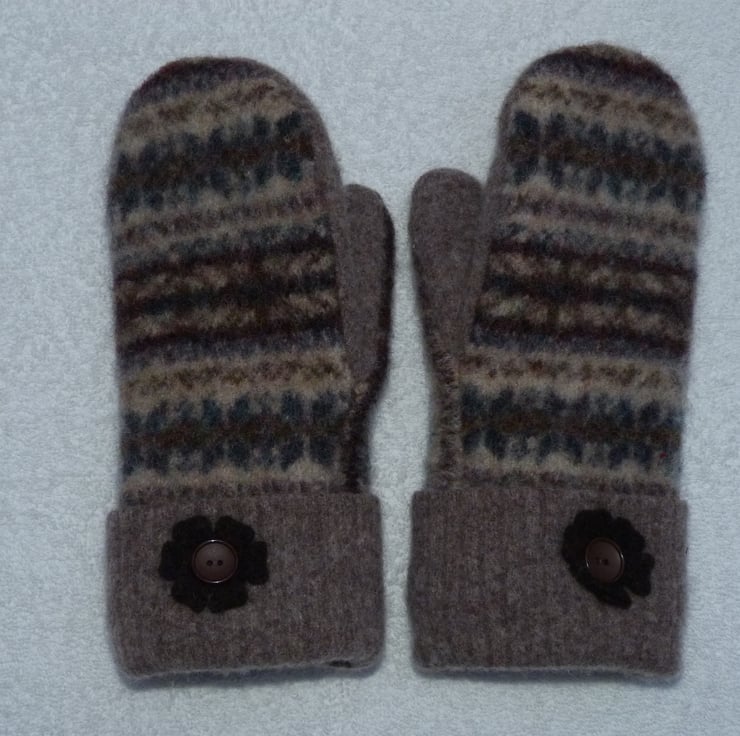 These warm and cosy winter mittens have been re-fashioned from up-cycled 100% wool sweaters. The jumpers have been washed and felted before stitching. A full lining for the mittens has been made from polyester polar fleece for warmth and comfort. A decorative felt flower with button center has been stitched to the cuff of the mittens.