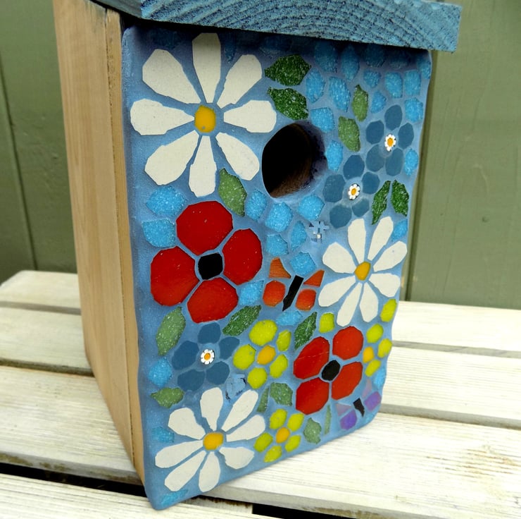 A standard bird nesting box with a mosaic decoration of wildflowers and two iridescent butterflies. The meadow includes poppies, daisies, buttercups and forget me nots. The roof is painted in pastel blue and the sides are finished with a clear paint. Both paints are bird safe.