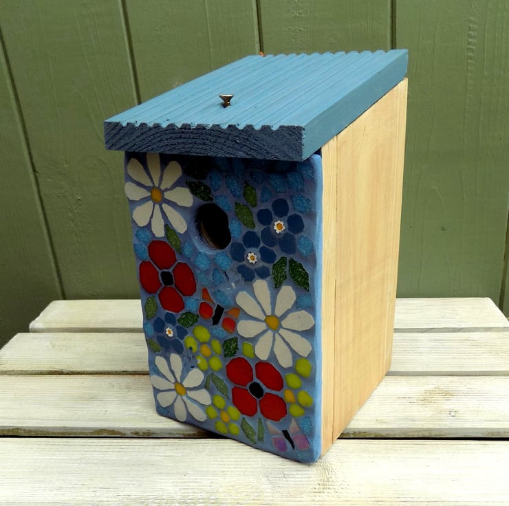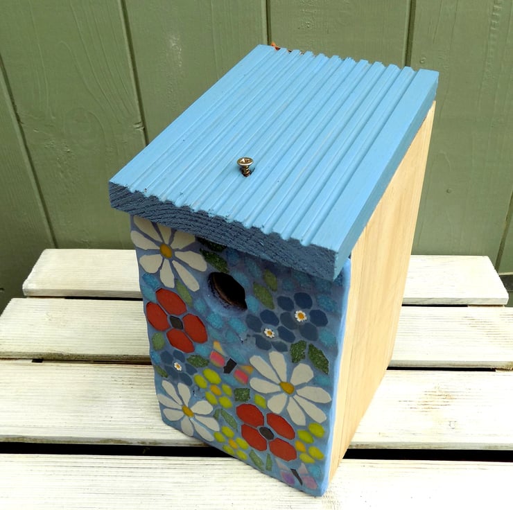 A standard wooden bird box with a mosaic made with vitreous glass tiles and finished with a blue grout designed to repel algae and mold, and finished with bird friendly weatherproof paints.It can be fixed by hanging onto a screw or nail (not surprised using the keyhole cut out at the rear of the box.