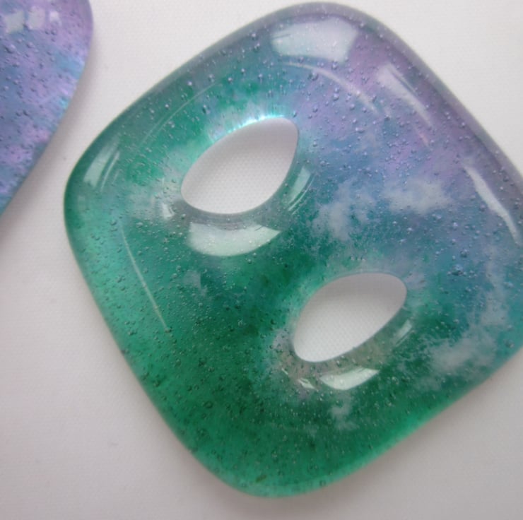 Each button is handmade and there will be some irregularities in shape due to this - do not expect perfectly matched holes! Frit casting is done by combining tiny pieces of glass, including clear, within a casting mould. This means that there may be variations of colour depth within the piece and this is normal.