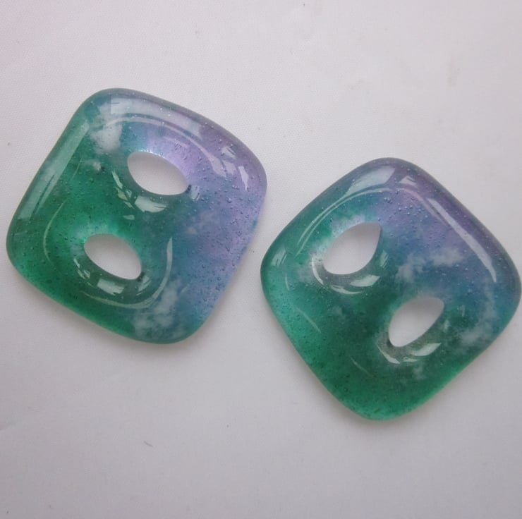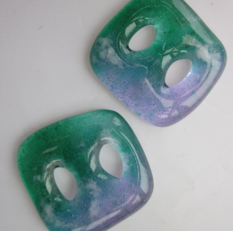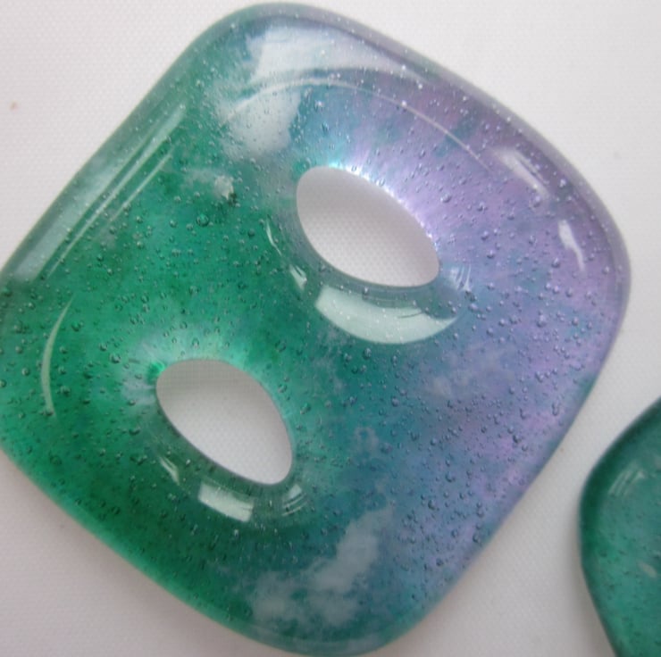 These buttons are made from transparent emerald green and lavender frit, with a hint of white, and are pleasantly wonky. They are approximately 3.5cm across. They will be perfect to fasten a bag or cardigan.