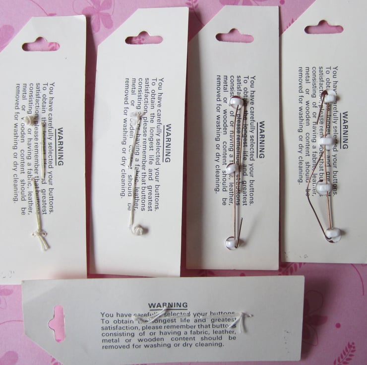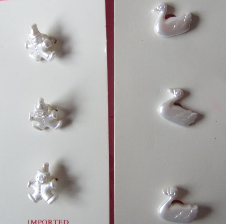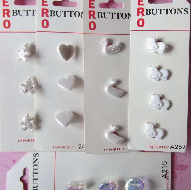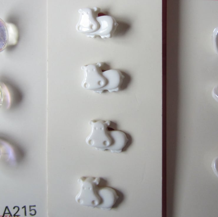 5 cards of Aero buttons; 3 clowns, 3 swans/ducks, 3 hearts, 4 hippos and 3 oval. The hippos are a matt white, the oval buttons have a sparkly mother of pearl look and the rest have a pearl sheen to them.