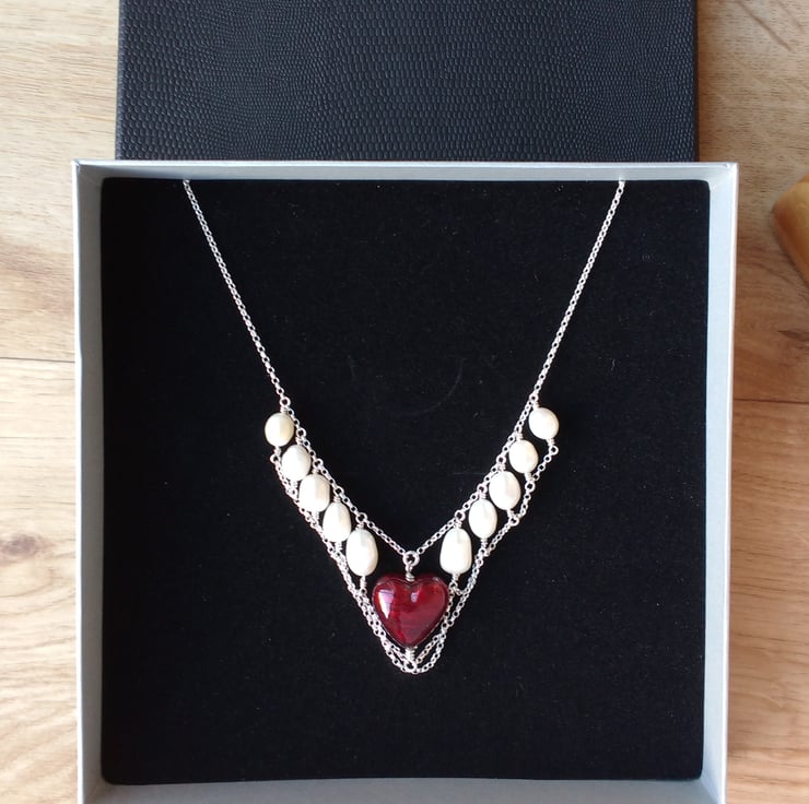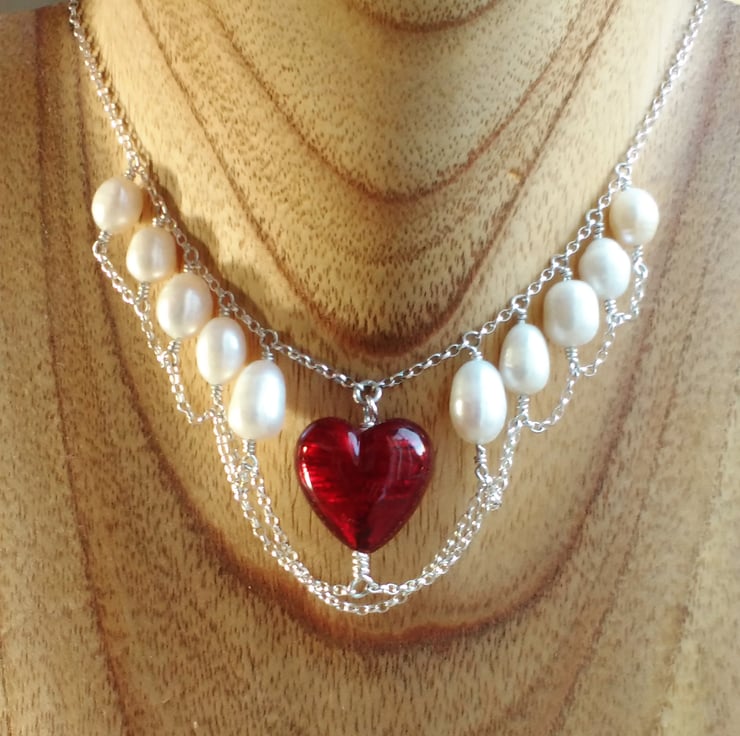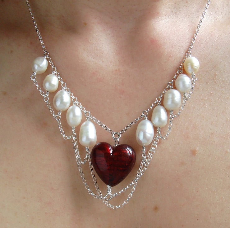 This is an ornate and glamorous Art Nouveau style freshwater pearl and genuine Murano heart necklace set in sterling silver draping chains. Murano glass is hand-made in Venice and this bead is garnet coloured glass over a core of real gold foil that gives it an unsurpassed depth of colour. The heart is a generous 20 mm 3/4" long and the white freshwater pearls are graduated between 9 and 12 mm or 3 to 4/8". It fastens securely with a bolt ring clasp stamped 925 for sterling silver.