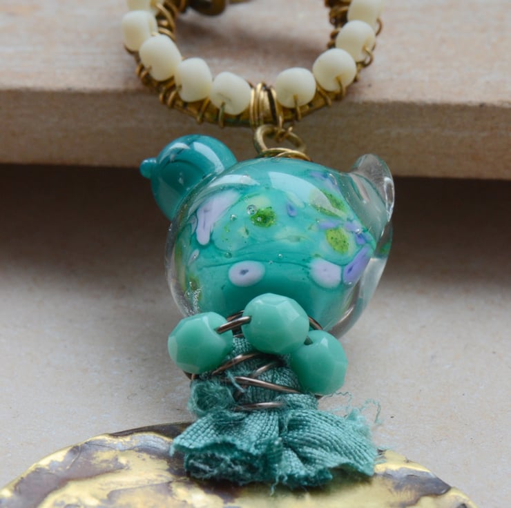 The pendant has been embossed, stamped and aged by me by hand. The lampwork glass bird is handmade by UK Artist Sandy Fulbrook.