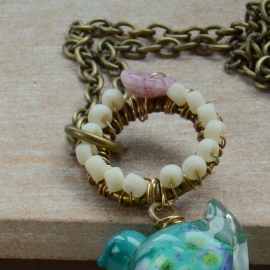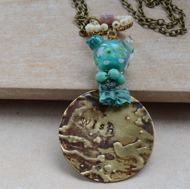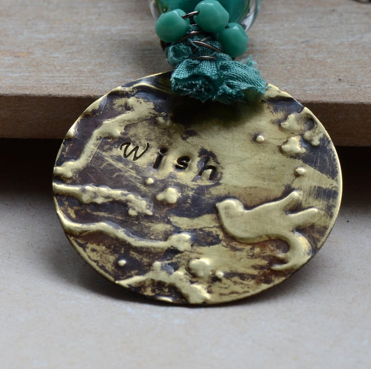 I have used a brass circular blank which I have embossed, added the word "wish" and naturally aged to give an antique effect. I have added a turquoise lampwork glass bird nestled on top of wire wrapped sari silk ribbon with Czech opaque turquoise glass beads and a hand wrapped connector ring with cream seed beads and Czech flower cups finished on antique bronze plated chain with trigger clasp.