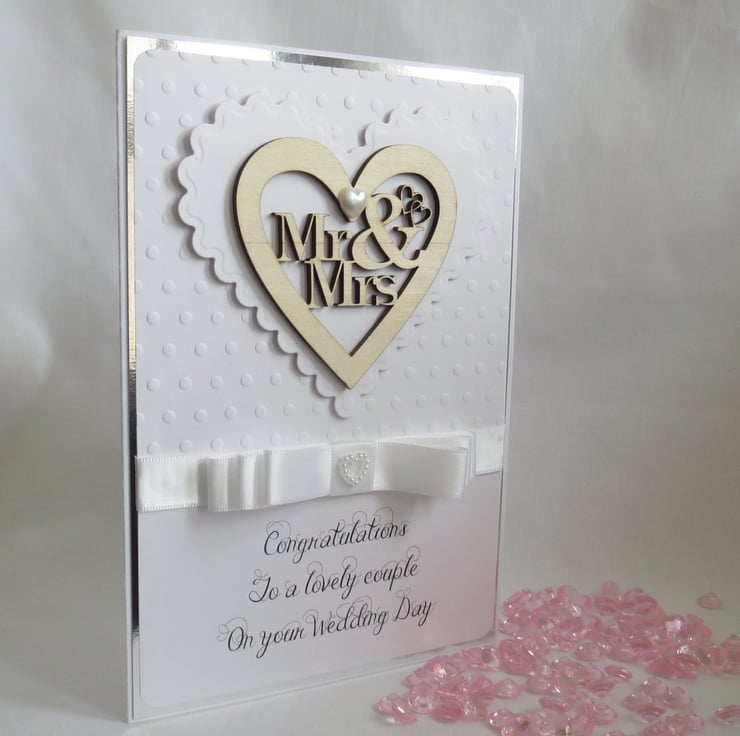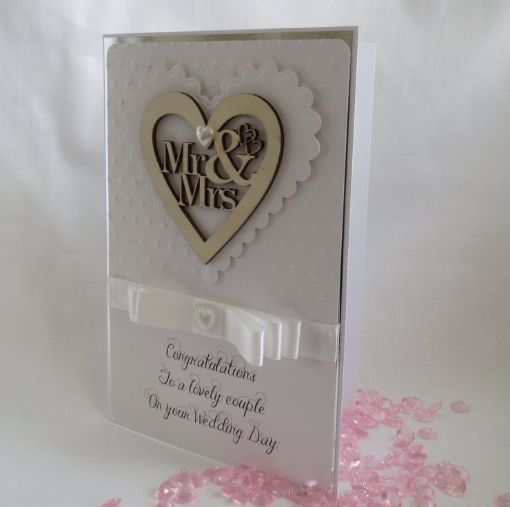 Design is made from a white 300gsm cardstock with a lovely naturel wood Mr & Mrs heart on the front