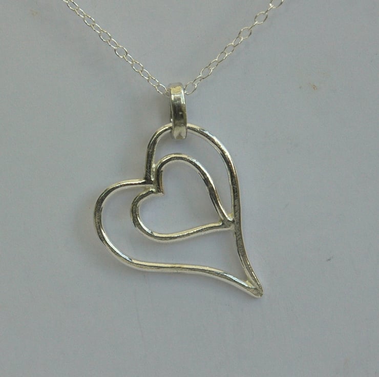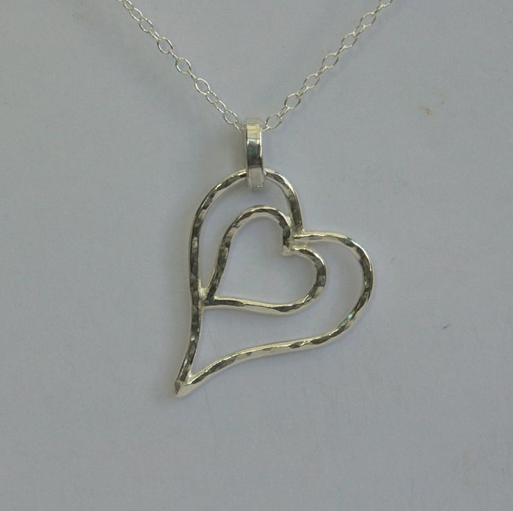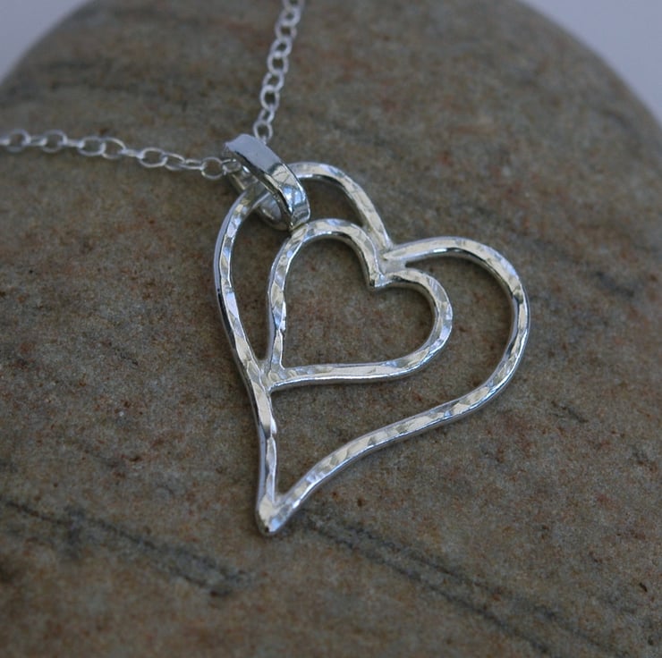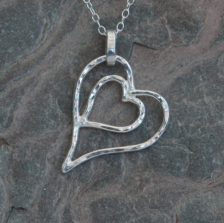 This gorgeous pendant is a perfect romantic gift for Valentine's day and would also make an ideal Mother's Day present! Two hearts are nestled one within the other and securely soldered together. The pendant is made from sterling silver wire, 1.5mm wide, which has been textured on one side with a ball-pein hammer to make it catch the light from many directions. The other side has been left smooth and polished, so you can ring the changes and wear it whichever way you feel like. The pendant is 3.5cm long, 2.6cm wide and weighs 3.0 g. It is attached by means of a sturdy oval bail to a 45cm (18inch) sterling silver trace chain.