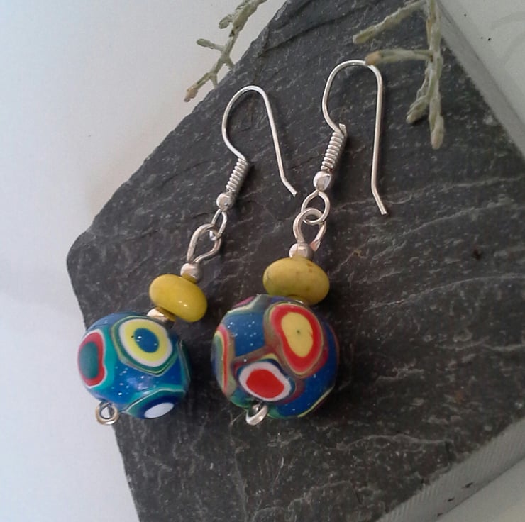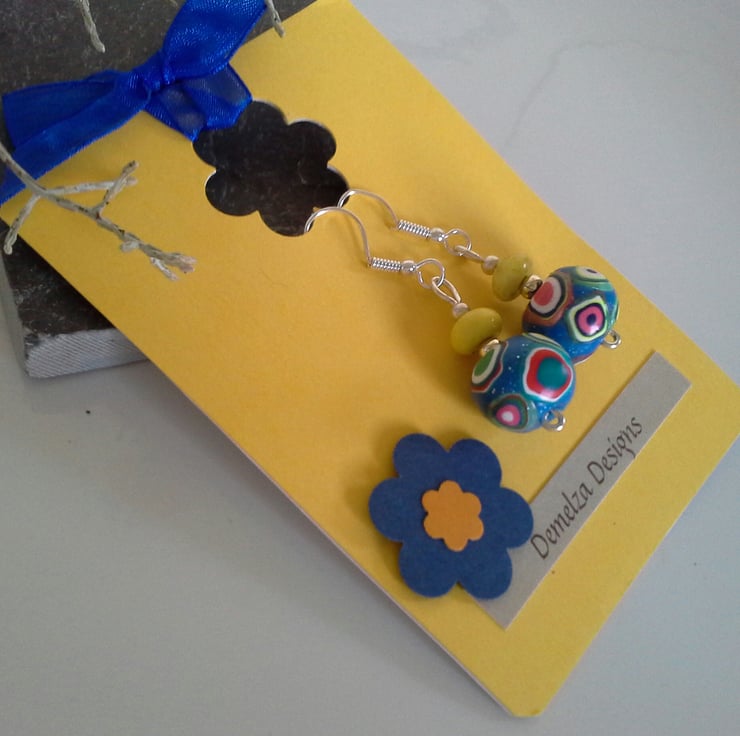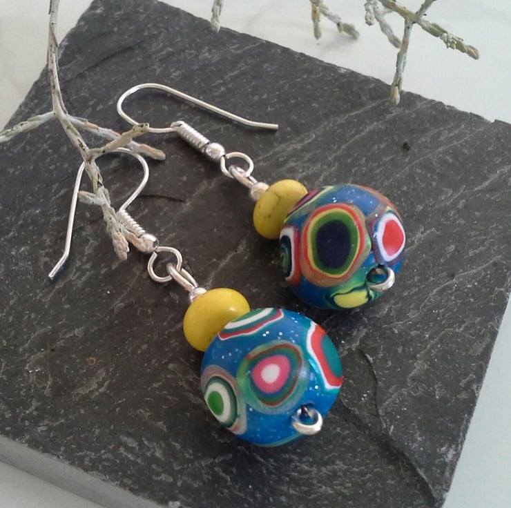 These bright colourful earings have been created from my own hand made decorative polymer clay beads complimented with a yellow magnesite gemstone bead. Between them are quality silver plated spacer beads and silver plated hooks. Other colour ways are available in my earing section.