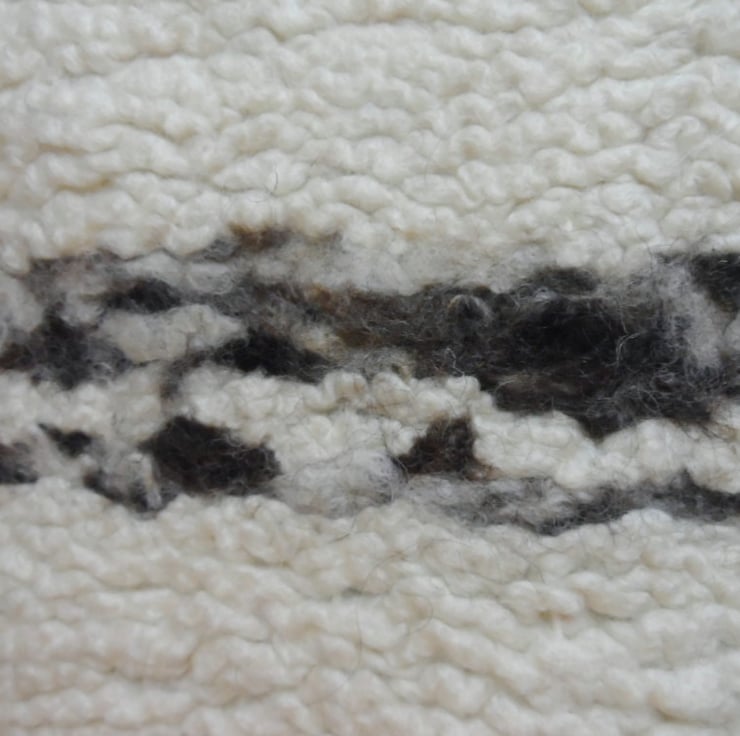 The cover on this cushion has been made from natural white wool which has been woven on a peg loom. A stripe of natural jacob fleece in black, grey, brown and white has been woven in the centre as a feature. After weaving it has been lightly felted and then stitched to a cream cotton calico backing fabric. It has a central back opening that is secured by velcro. The cushion cover measures approximately 35cm x 31cm and can take cushions up to 40cm x 40cm which will give it a very full, firm feel. It has been photographed with a 40cm x 40cm cushion pad inserted and will be provided with this size.