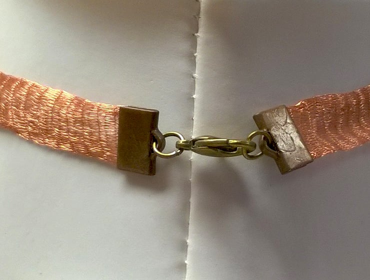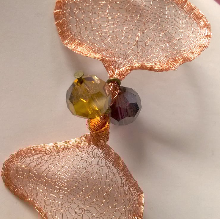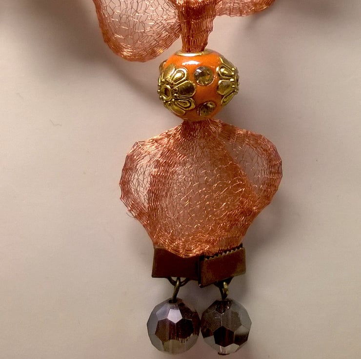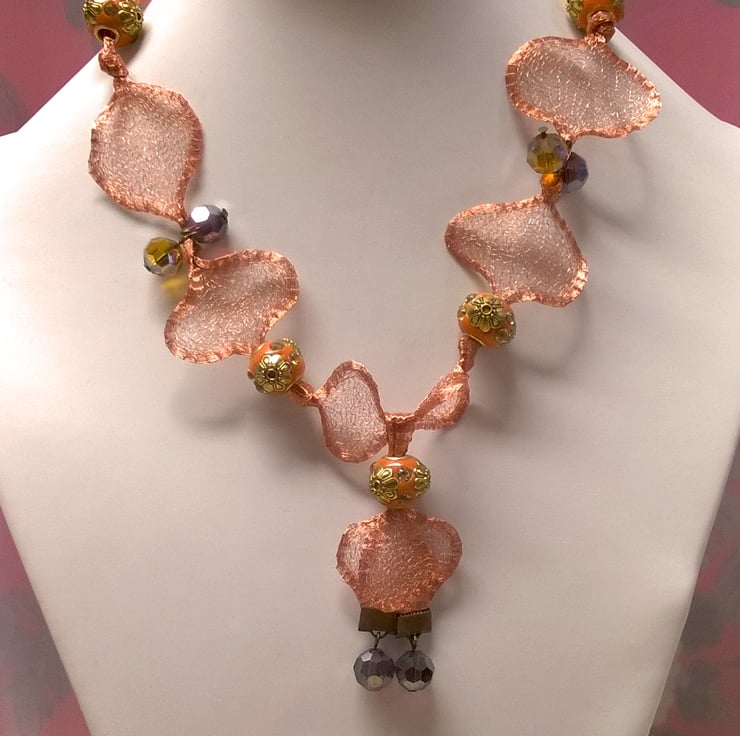 16 inch necklace, plus 2.5 inch drop. Made with Artistic Copper colour Wire mesh which has been sculpted into this beautiful shape. Copper/Orange coloured indonesian beads edged with gold colour and diamantes. Copper and gold coloured crystals. Lobster clasp fastening. Comes wrapped in tissue paper and organza bag.