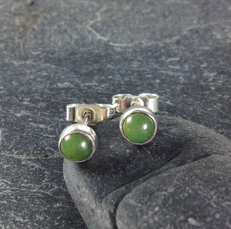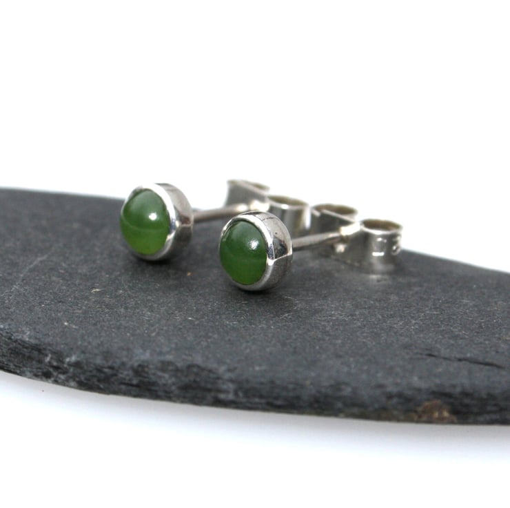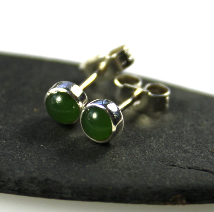 Simple sterling silver stud earrings set with vibrant green jade cabochons.