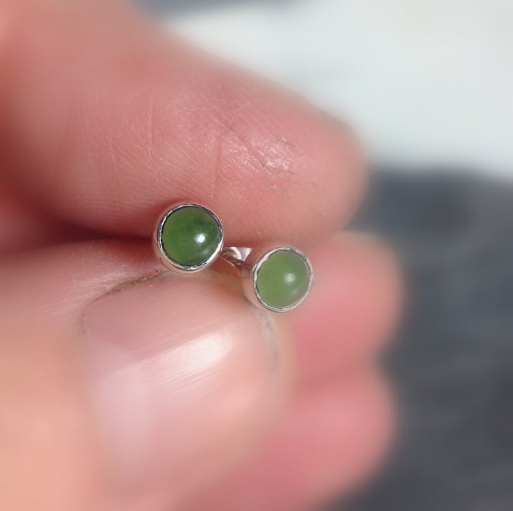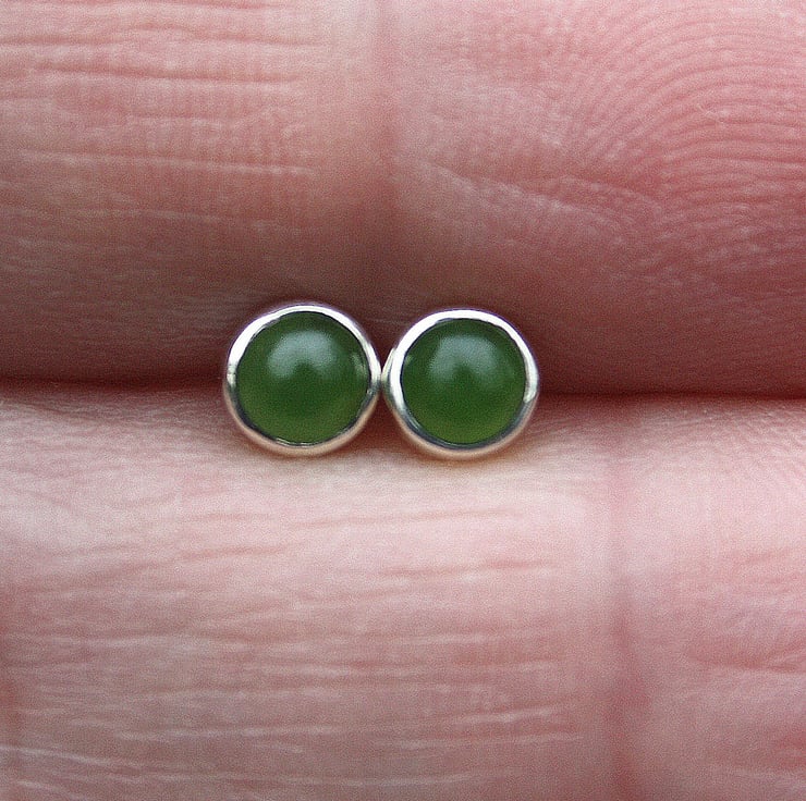 The jade cabs measure 4 mm diameter. The silver has been polished to a bright finish.