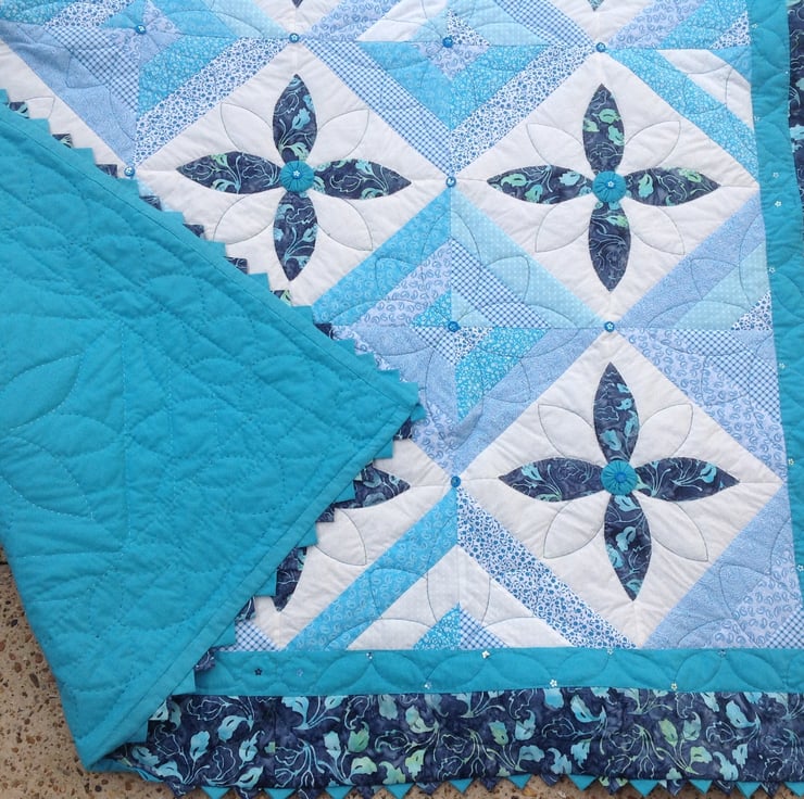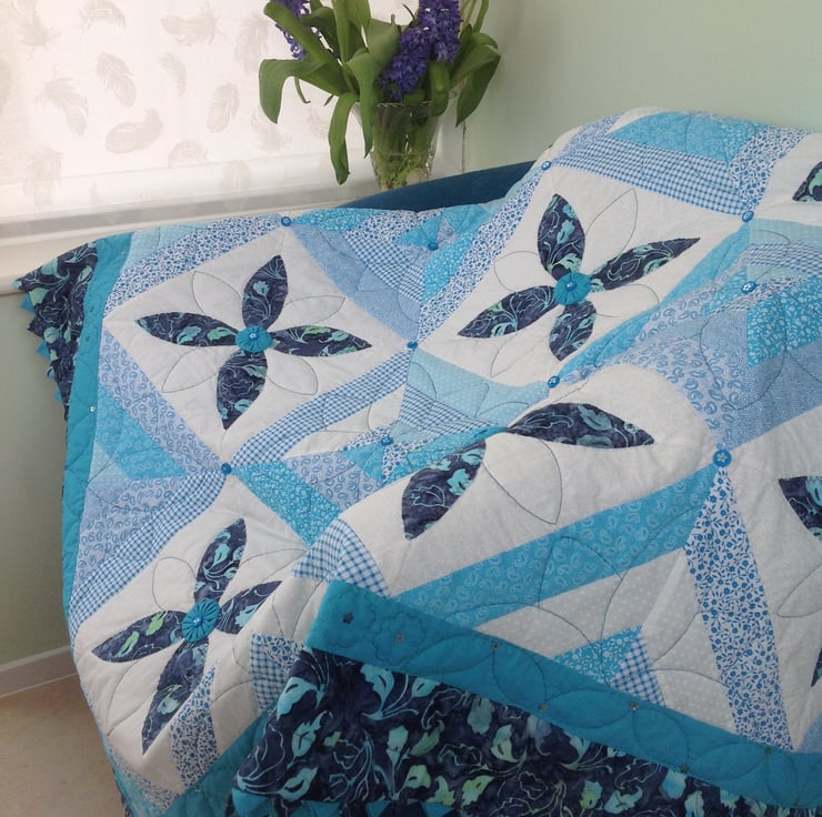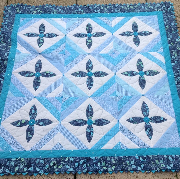 This is a really fresh looking turquoise blue and white patchwork quilt that I have appliqued flowers on to and hand quilted it. I have added embellishments of Suffolk Puffs ,buttons and sequens and also added a prairie point edge. I have used some really pretty batik fabric that really teams up with the turquoise blue and white fabric.