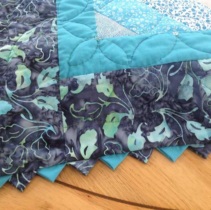 I purchased some gorgeouse blue Batik fabric and looked out for different turquoise blue and white fabrics to compliment it. I have backed it with plain turquoise blue fabric.
