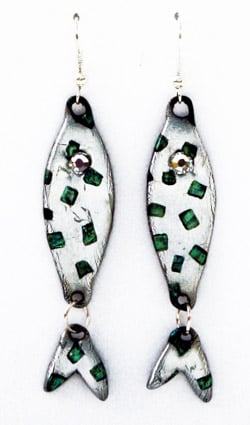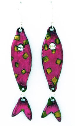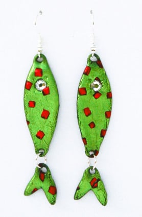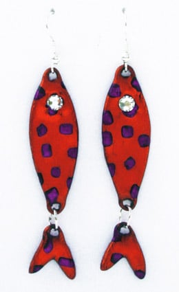 These fish earrings are approximately 6cms long from wire to tip. They are available in five colourways: light blue//red; red/purple; silver/softfgreen; light green/orange; pink/dark gold, all with Swarovski crystal eyes. Please specify colour choice in your order. If you do not specify, I will send light blue/red.